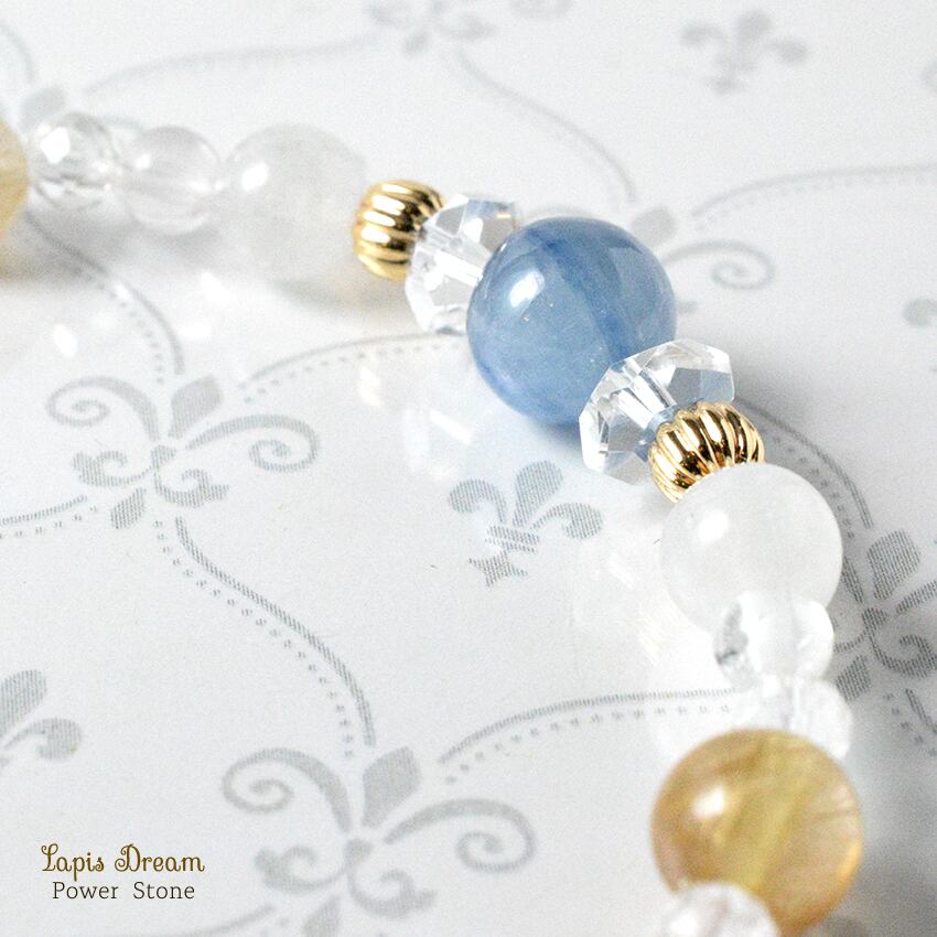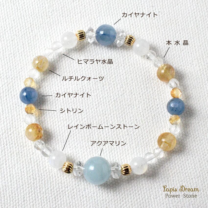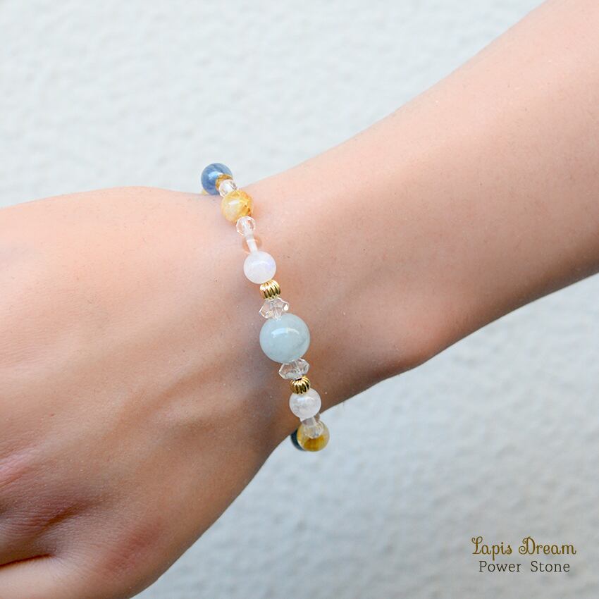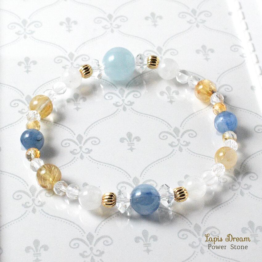 こちらは、アクアマリンを主役に、カイヤナイトとルチルクォーツを組み合わせた、勇気と幸運を引き寄せるパワーストーン ブレスレットです。