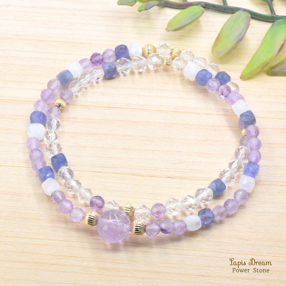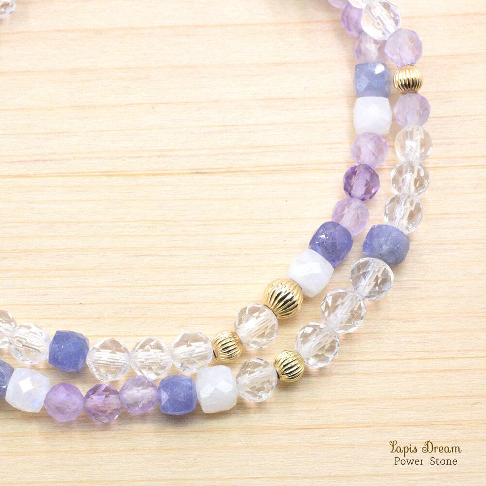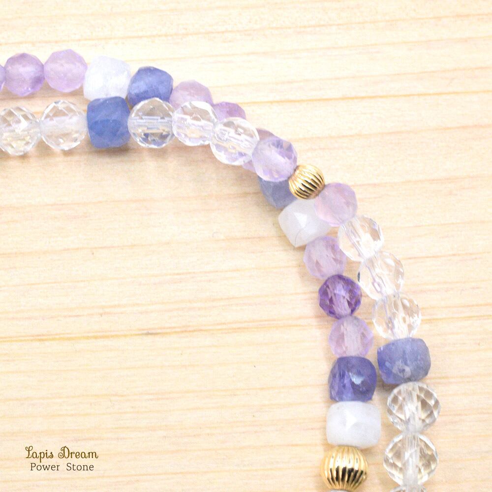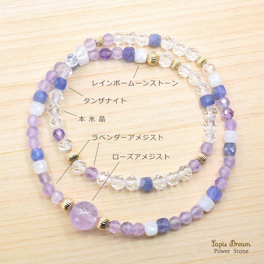 そんなローズアメジストをメインに、上品な煌めきが美しい、キューブ型のタンザナイトとレインボームーンストーンを添えて、2連ブレスレットとして使えるパワー.ストーン ブレスレットを制作しました。