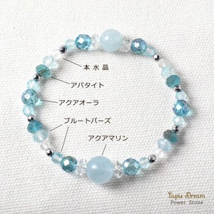 そして、「心を癒し、幸福感がアップする」効果があるとされるアクアマリン、ブルートパーズで制作したパワーストーン ブレスレットです。