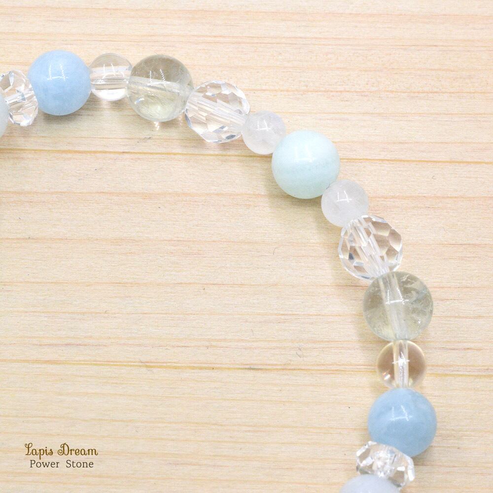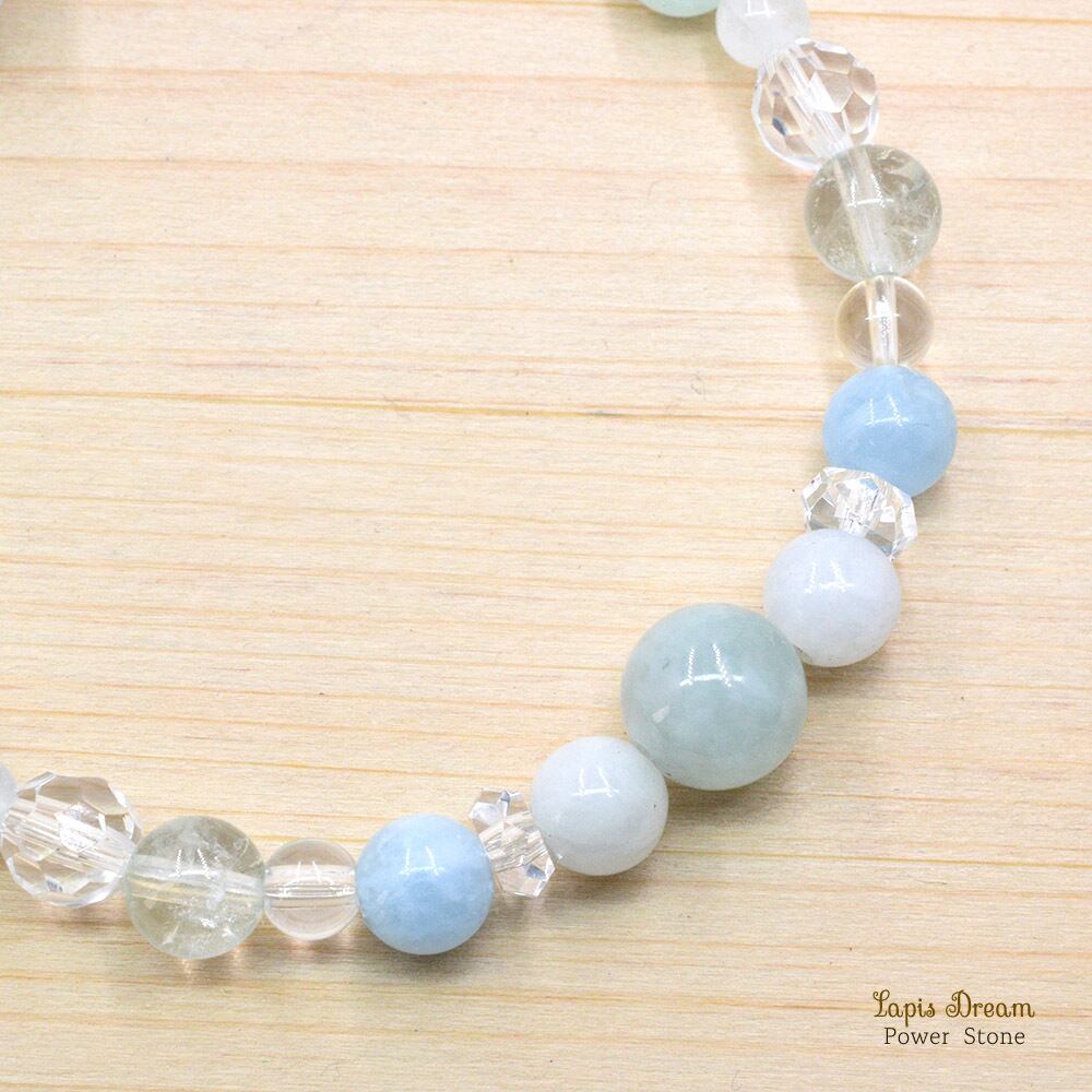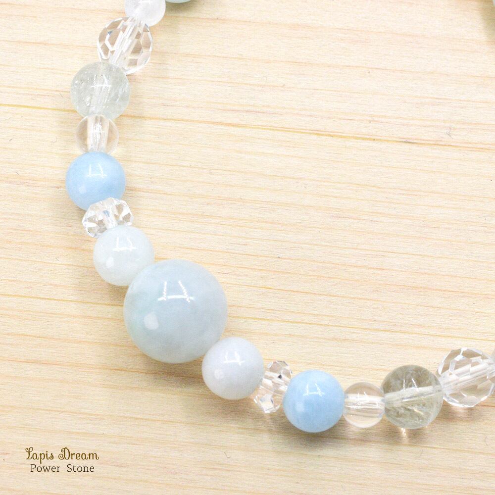 そんなビルマ翡翠を主役に、同じく「幸運を呼び込む」効果のあるアクアマリンを配し、穏やかで気品のあるパワーストーン ブレスレットを制作しました。