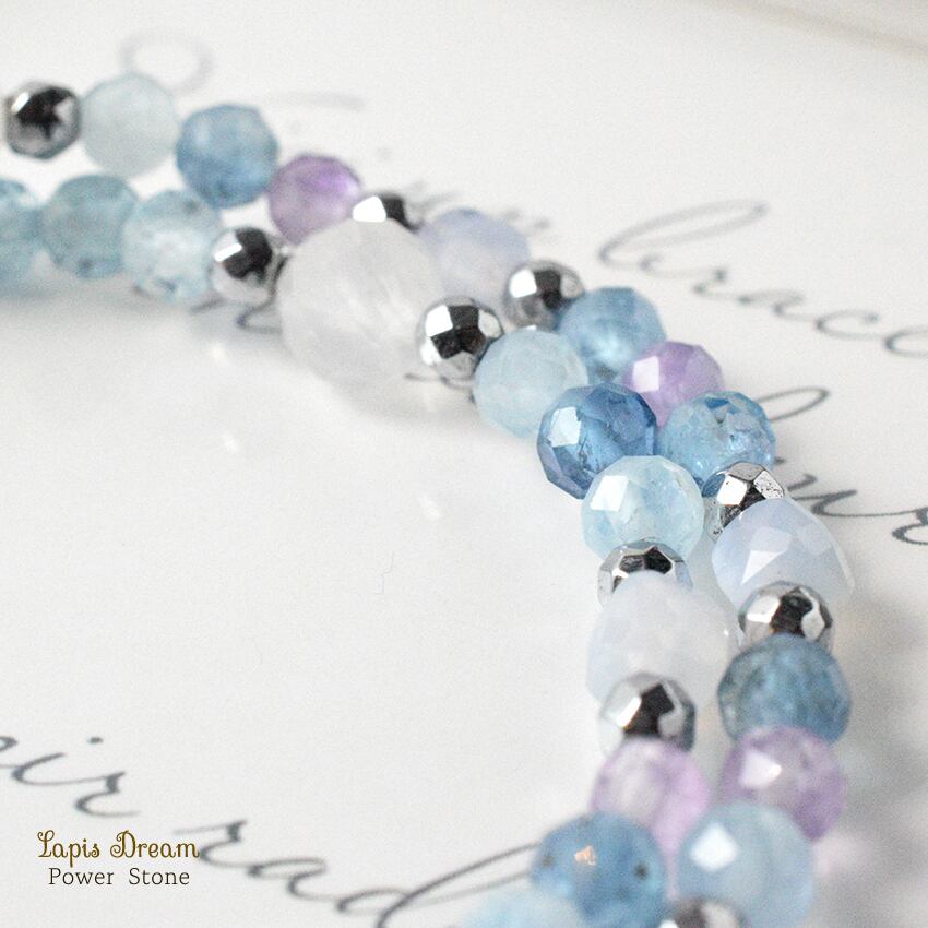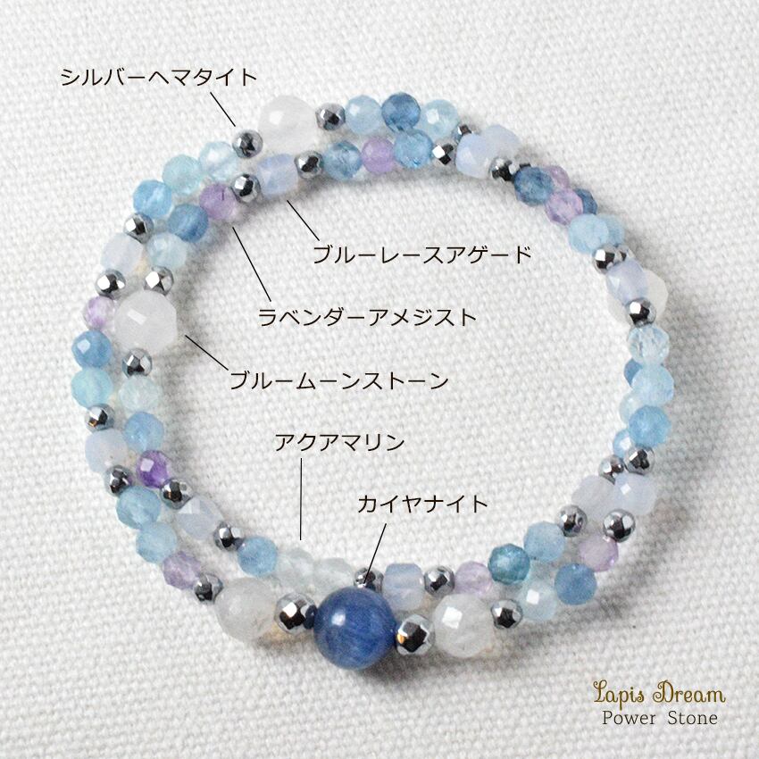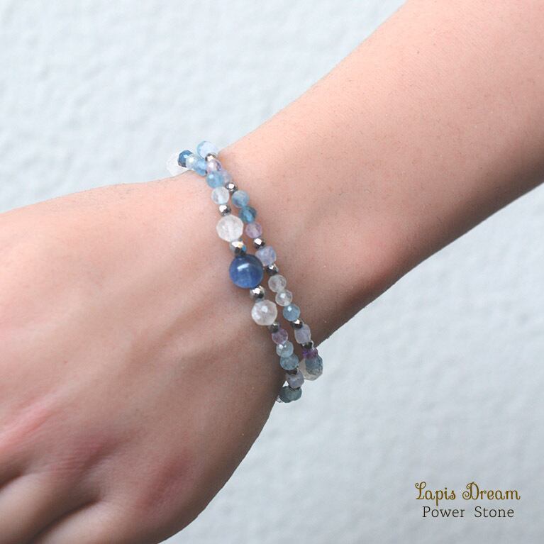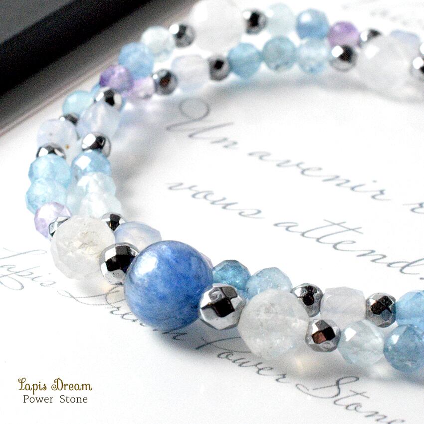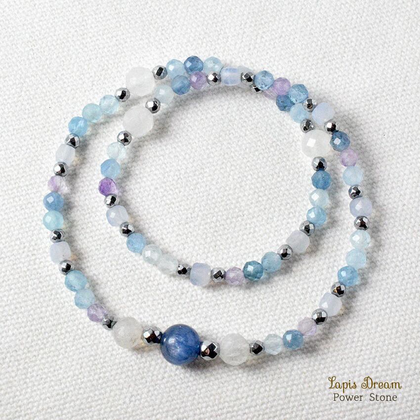 カイヤナイトとアクアマリンを組み合わせた、精神の安定と癒しをもたらすパワーストーンブレスレットです。