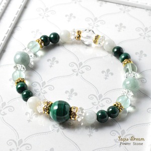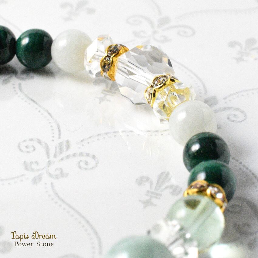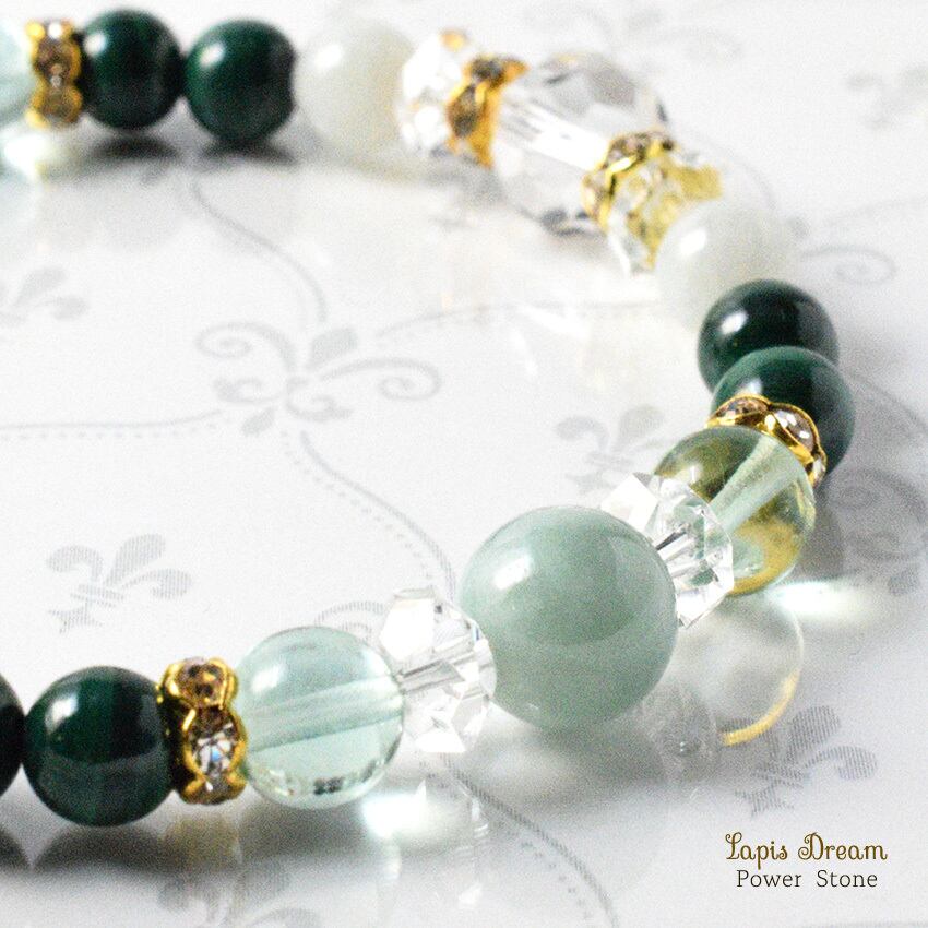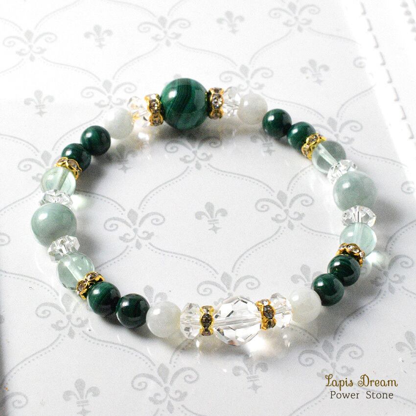 深い森の緑を閉じ込めたかのようなマラカイトを主役に、ビルマ翡翠のやわらかな光を添えたパワーストーン ブレスレットです。