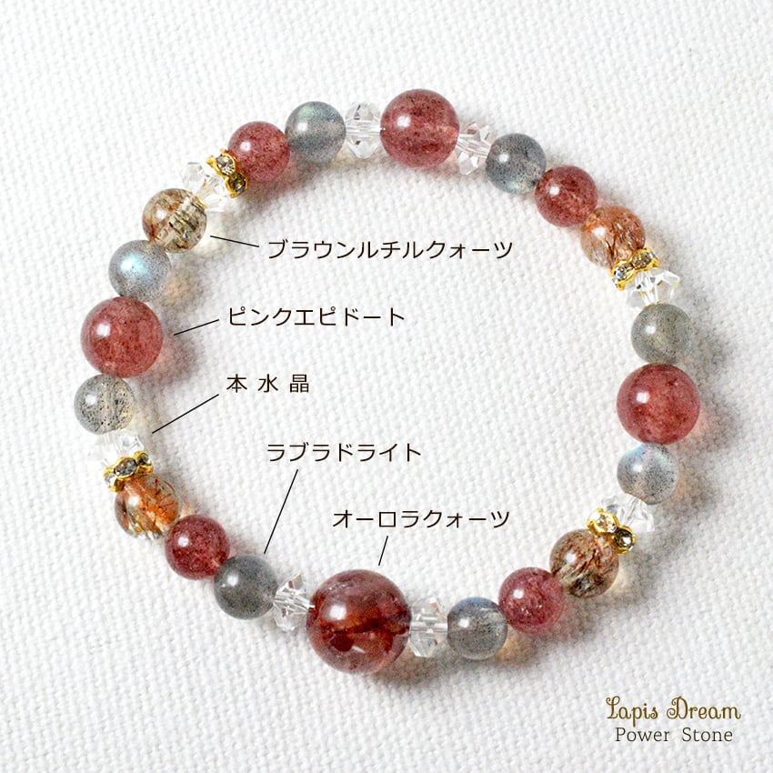 オーロラクォーツの虹色の光と、ピンクエピドートの温かな愛の波動を重ねた、心にそっと寄り添うパワーストーン ブレスレットです。