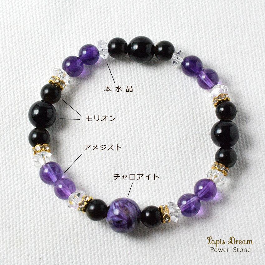 チャロアイト・モリオン・アメジストを組み合わせた「強い清浄の波動が宿るお守り」のパワーストーンブレスレットです。
