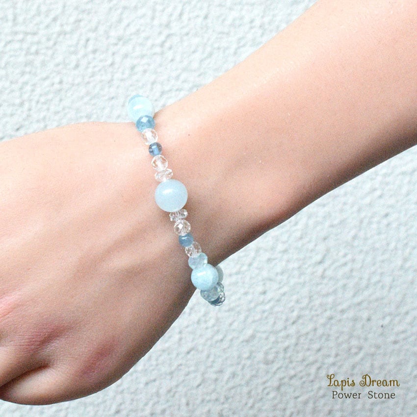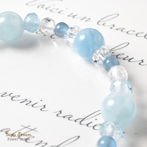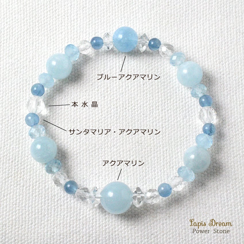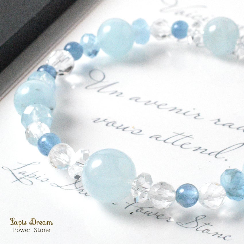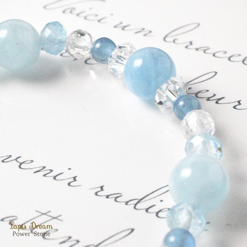 感情の流れをやさしく整え、穏やかな気持ちを取り戻すために仕立てた、さまざまな形のアクアマリンを用いたパワーストーンブレスレットです。