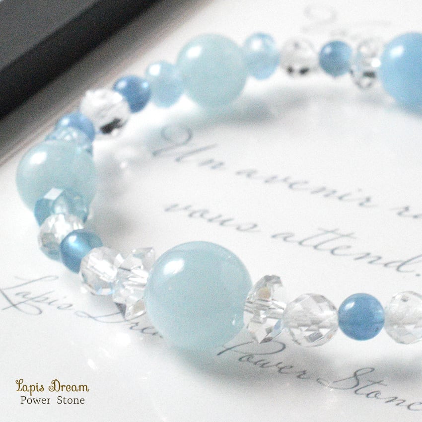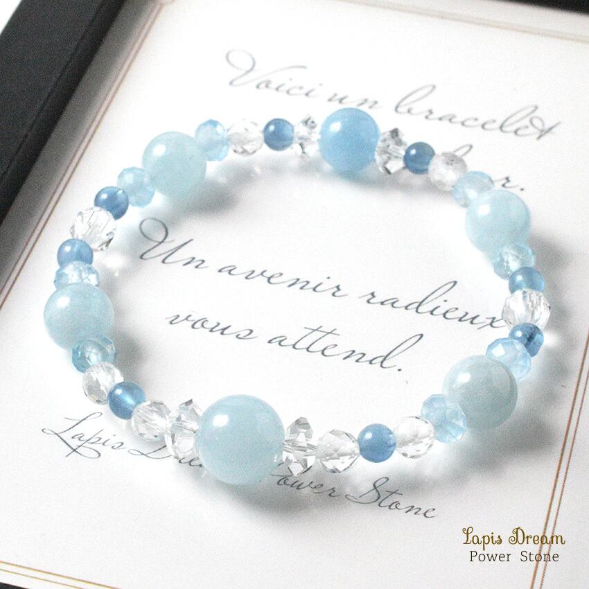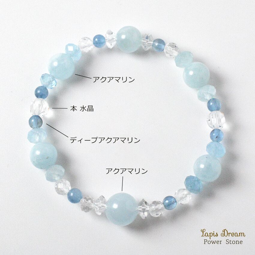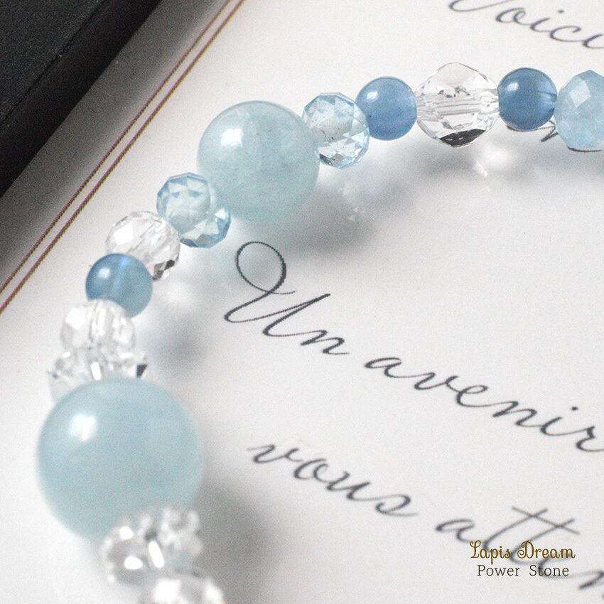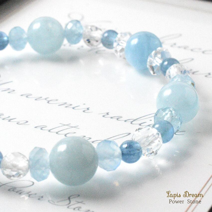 感情の流れをやさしく整え、穏やかな気持ちを取り戻すために仕立てた、さまざまな形のアクアマリンを用いたパワーストーンブレスレットです。