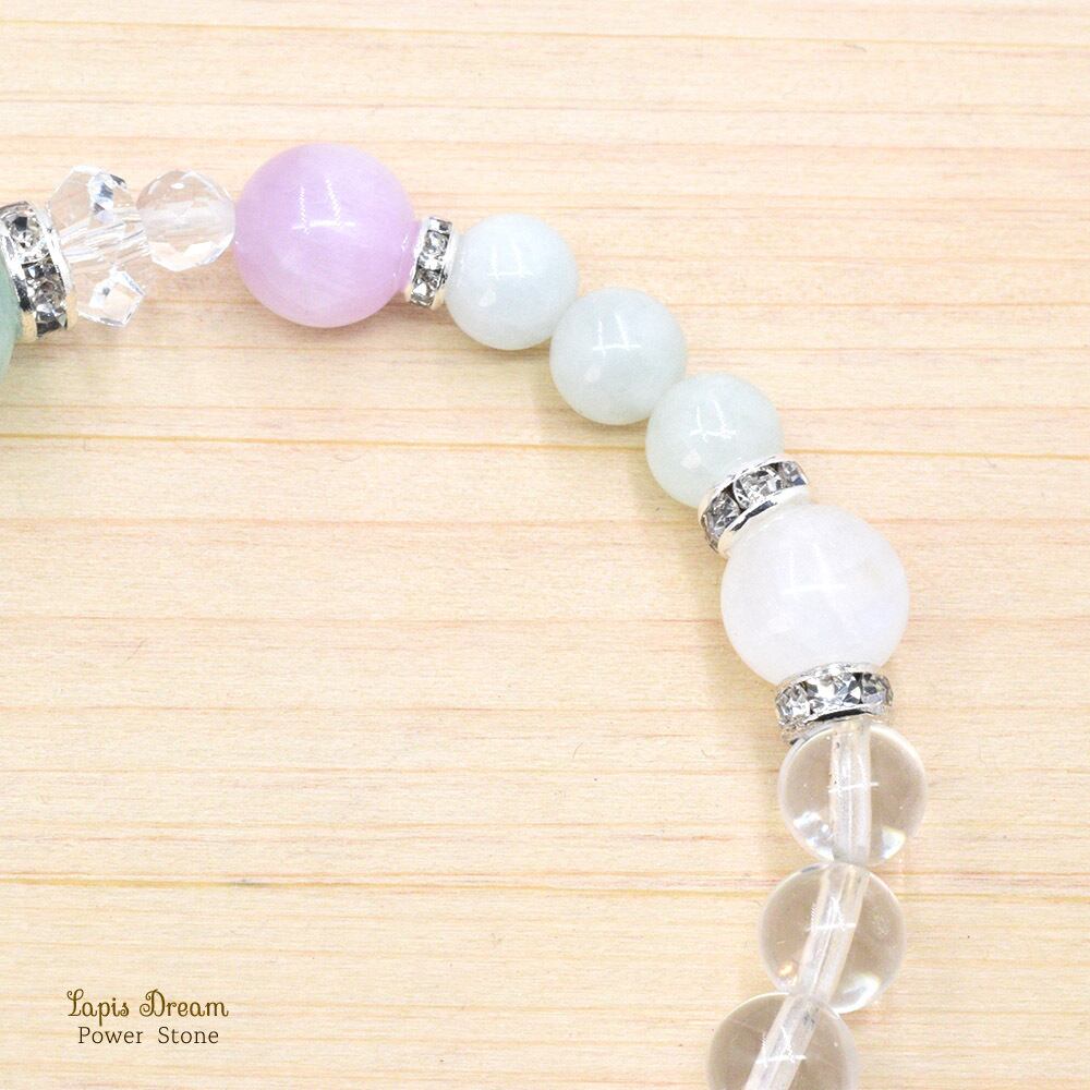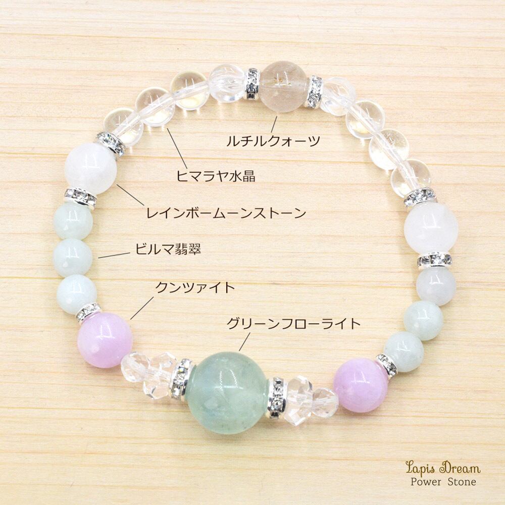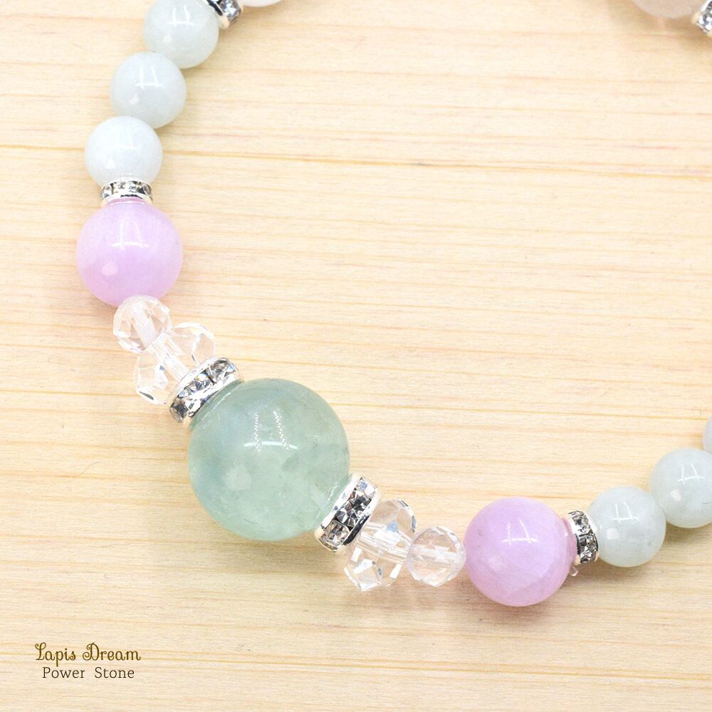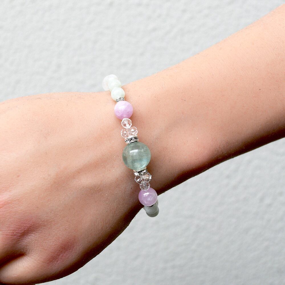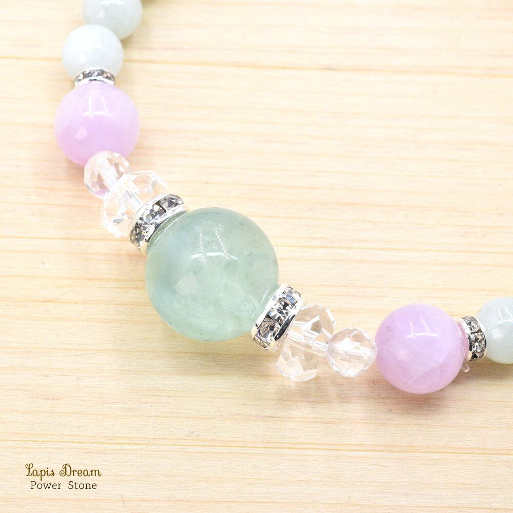 そのグリーンフローライトを取り囲むように、「マイナスのエネルギーの浄化」「強い浄化効果」と言った「浄化作用」がある ヒマラヤ水晶、クンツァイトなどを組み合わせた「悪い氣を取り払い、魂の浄化をする」パワーストーン ブレスレットを制作しました。