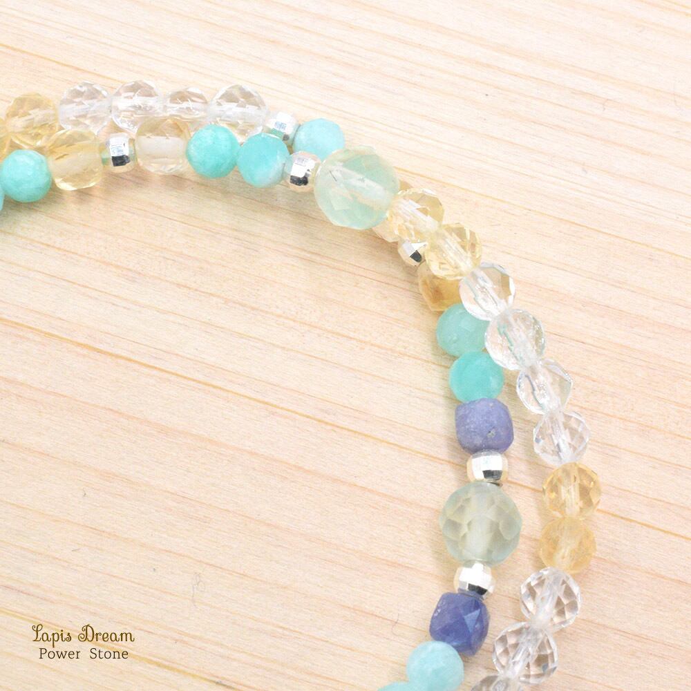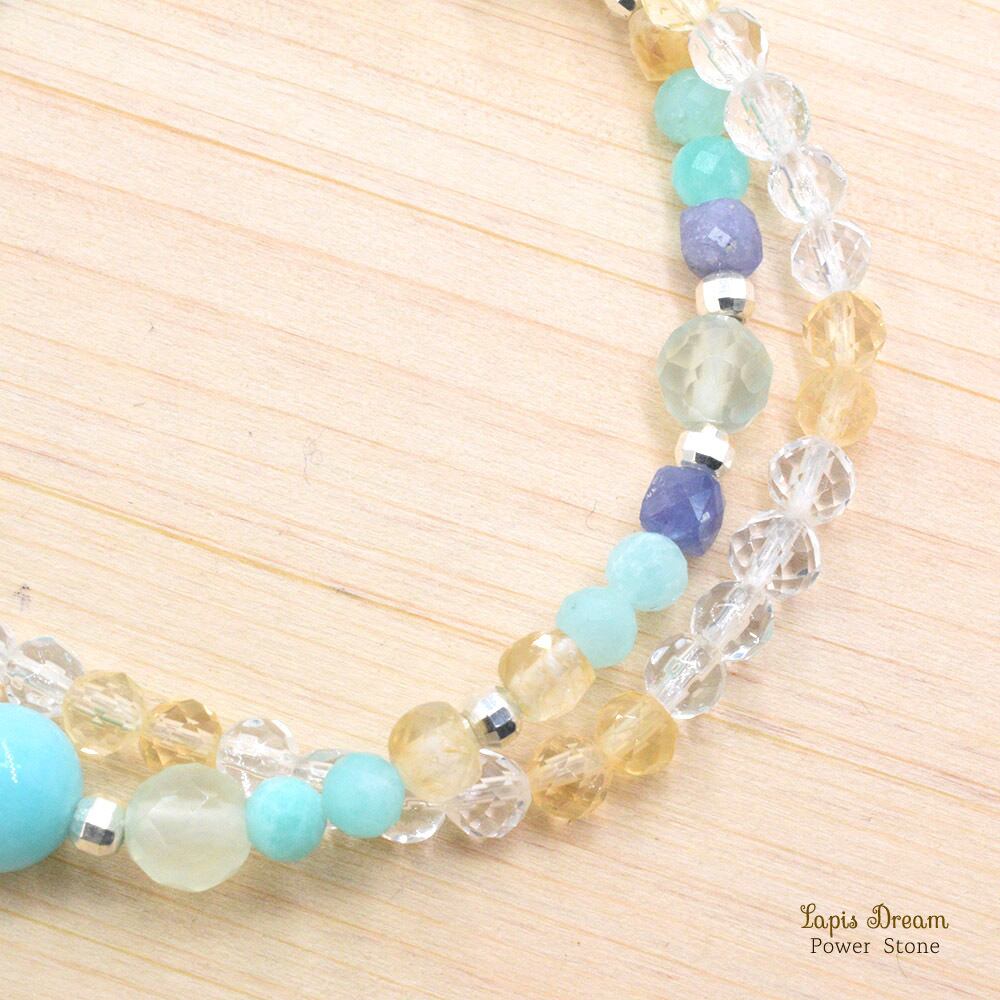 カラフルな天然石と、透明度の高いカット水晶のコントラストが美しい、どんなファッションにも合わせやすいブレスレットです。