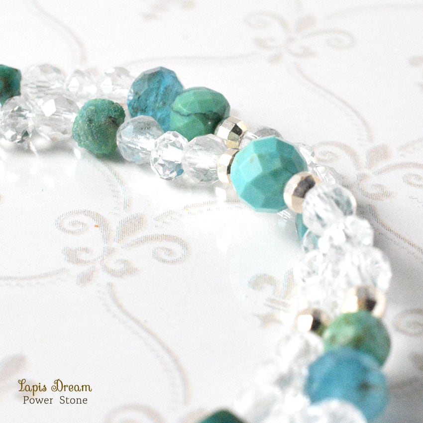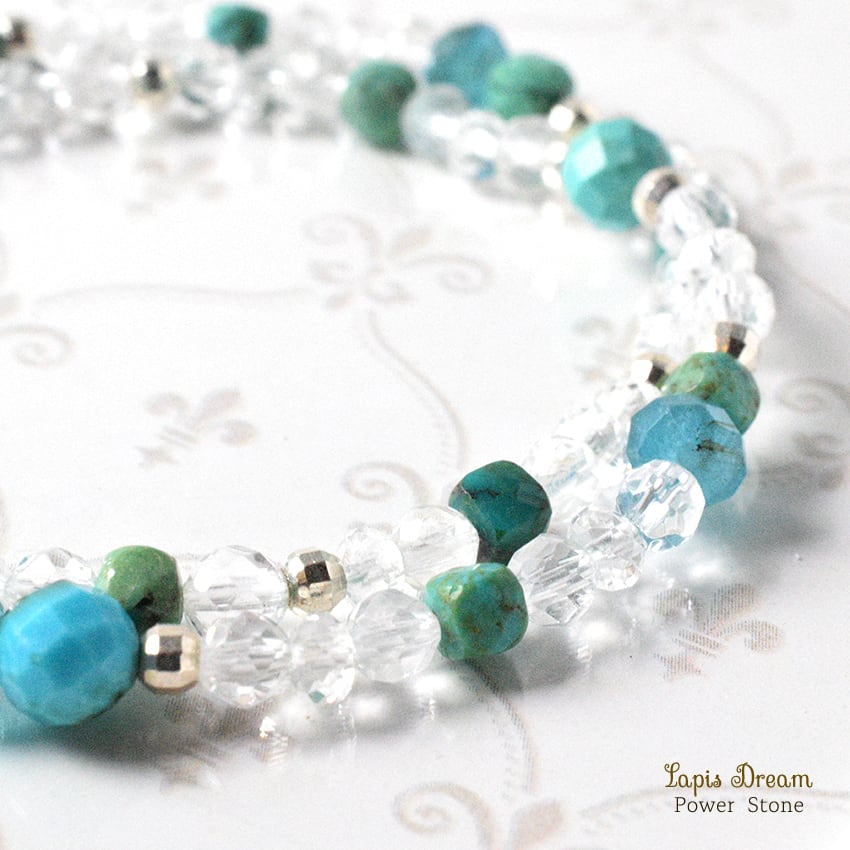 神秘的な天然ターコイズと、キラキラと輝くカット本水晶、そして、Silver925ビーズのコンビネーションが素敵なブレスレットです。