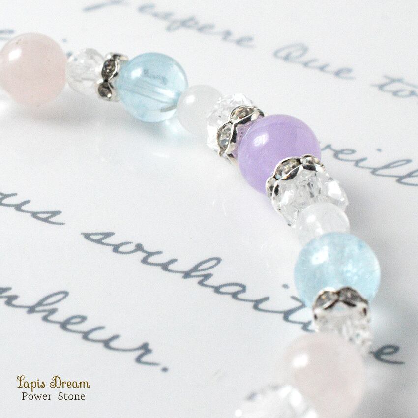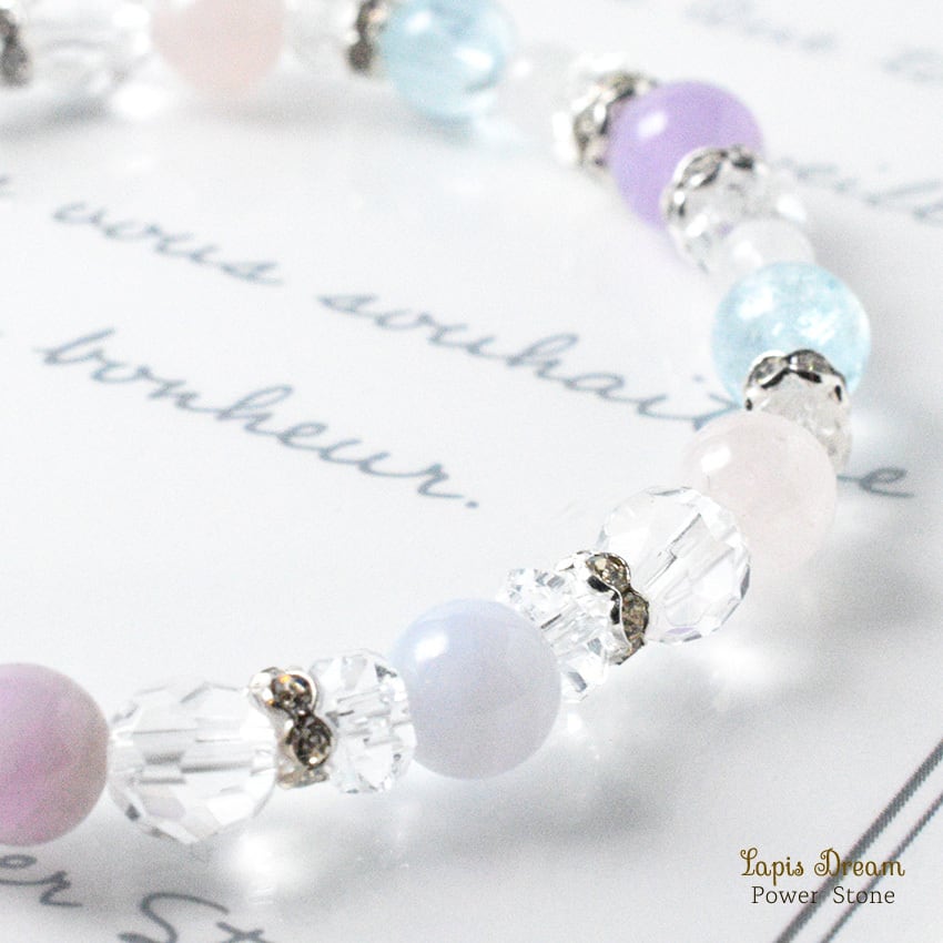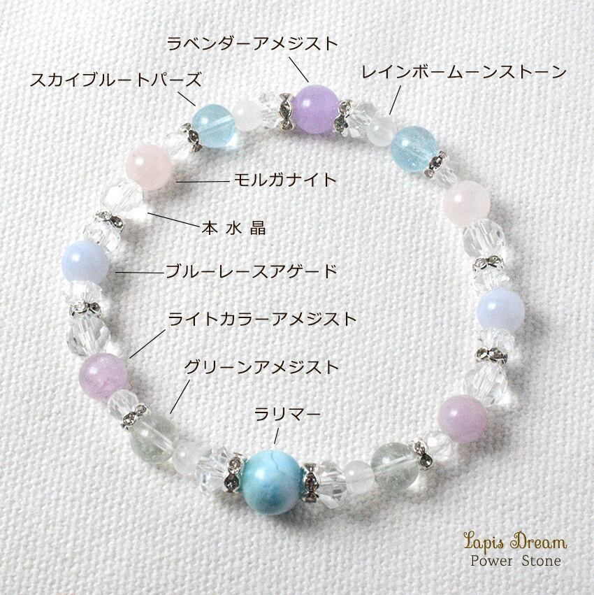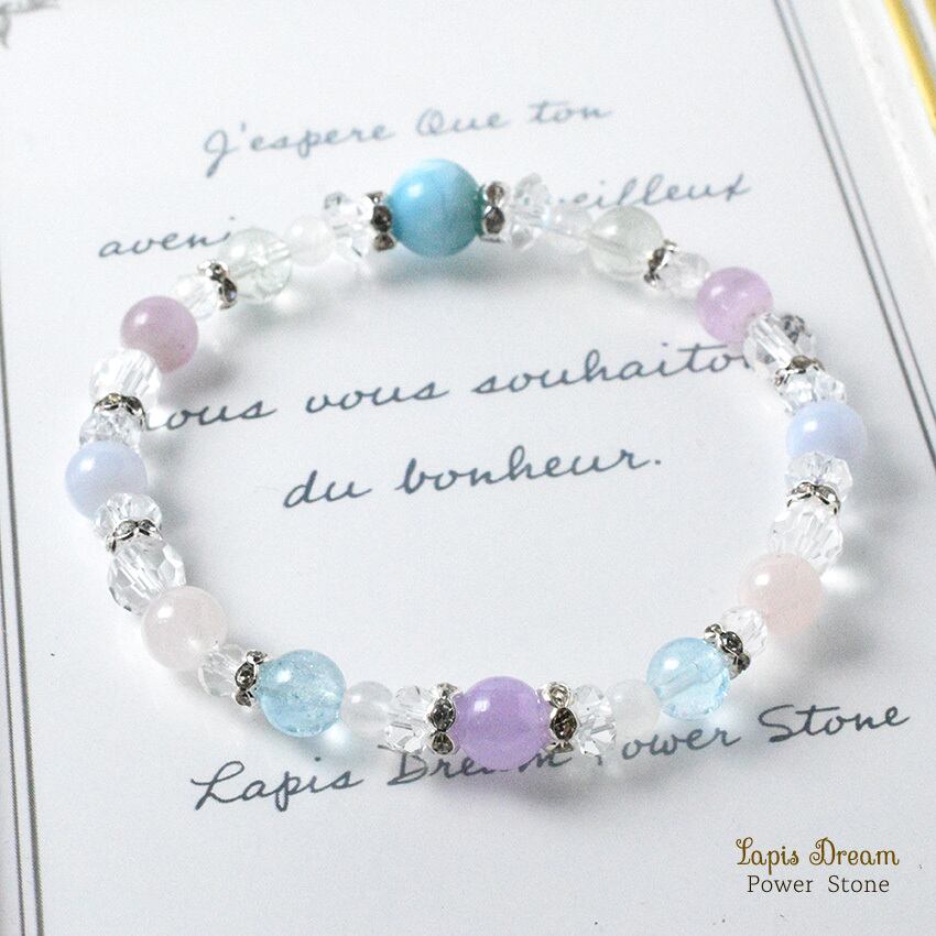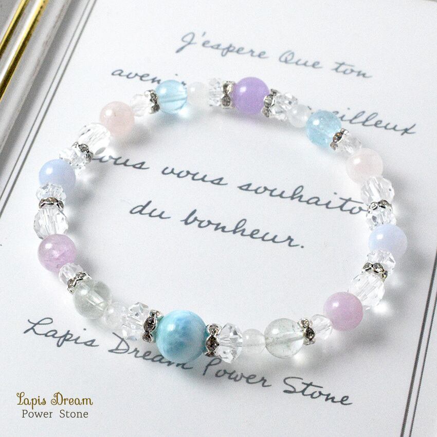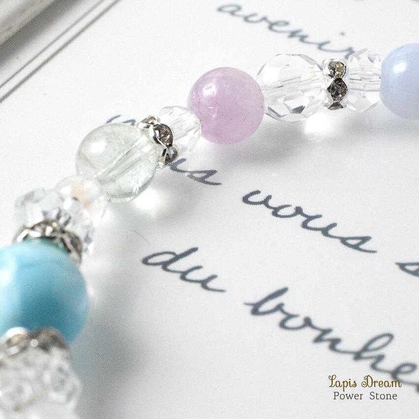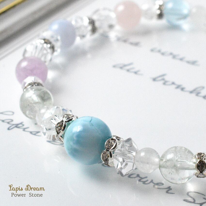 そんなラリマーを中心に、「人間関係を円滑にする」「穏やかな気持ちになる」と言われる天然石を組み合わせて制作した天然石ブレスレットです。