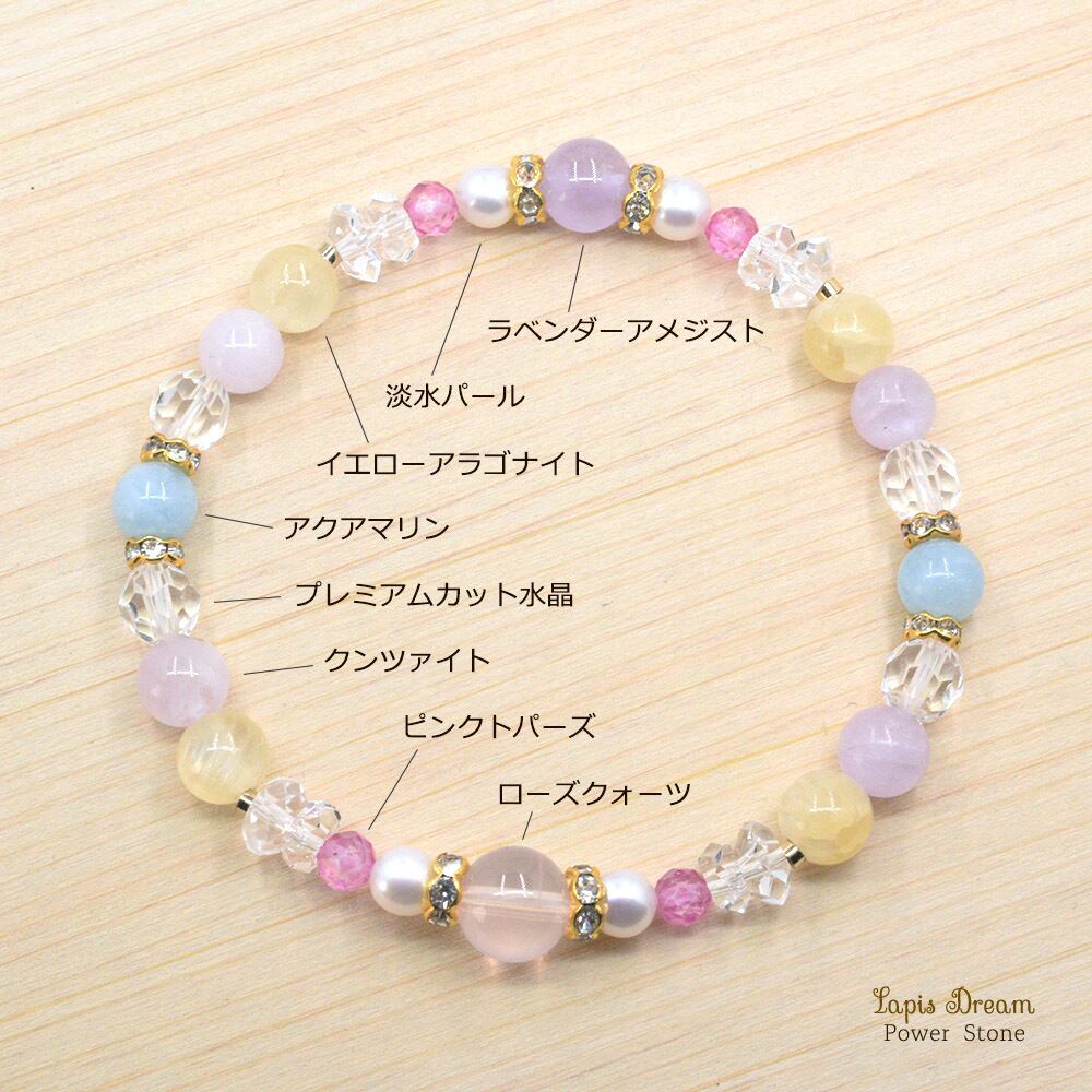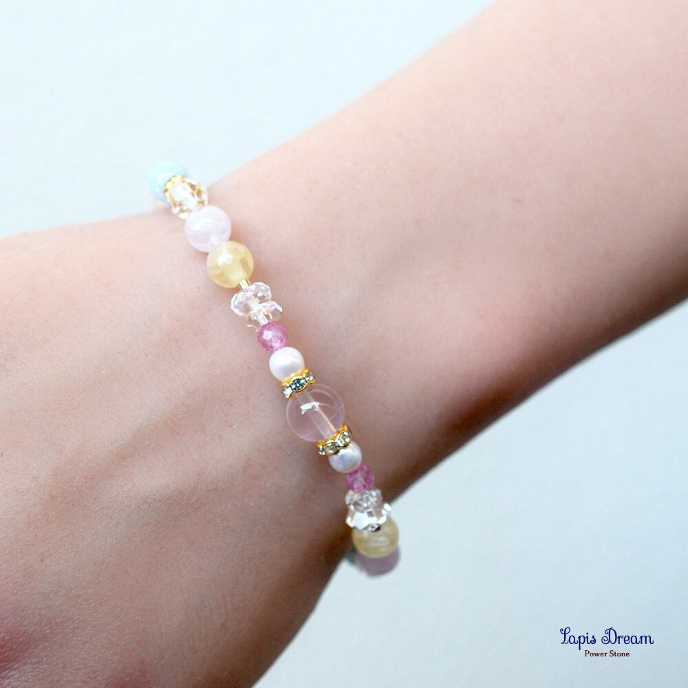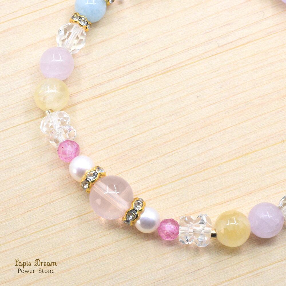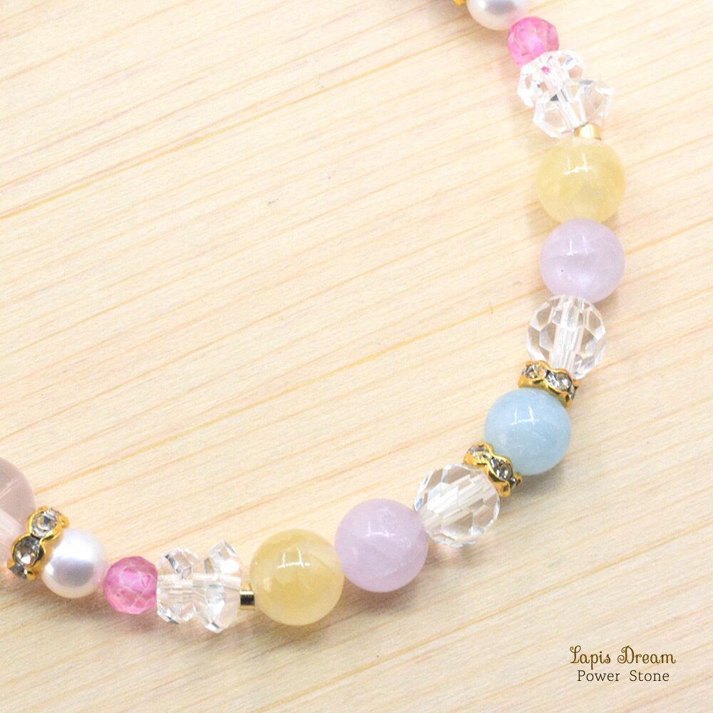 そんな淡い優しい色合いのスターローズクォーツを中心に、「心を癒す」「ストレスの軽減」の効果があると言われているクンツァイト、イエローアラゴナイトを配しました。