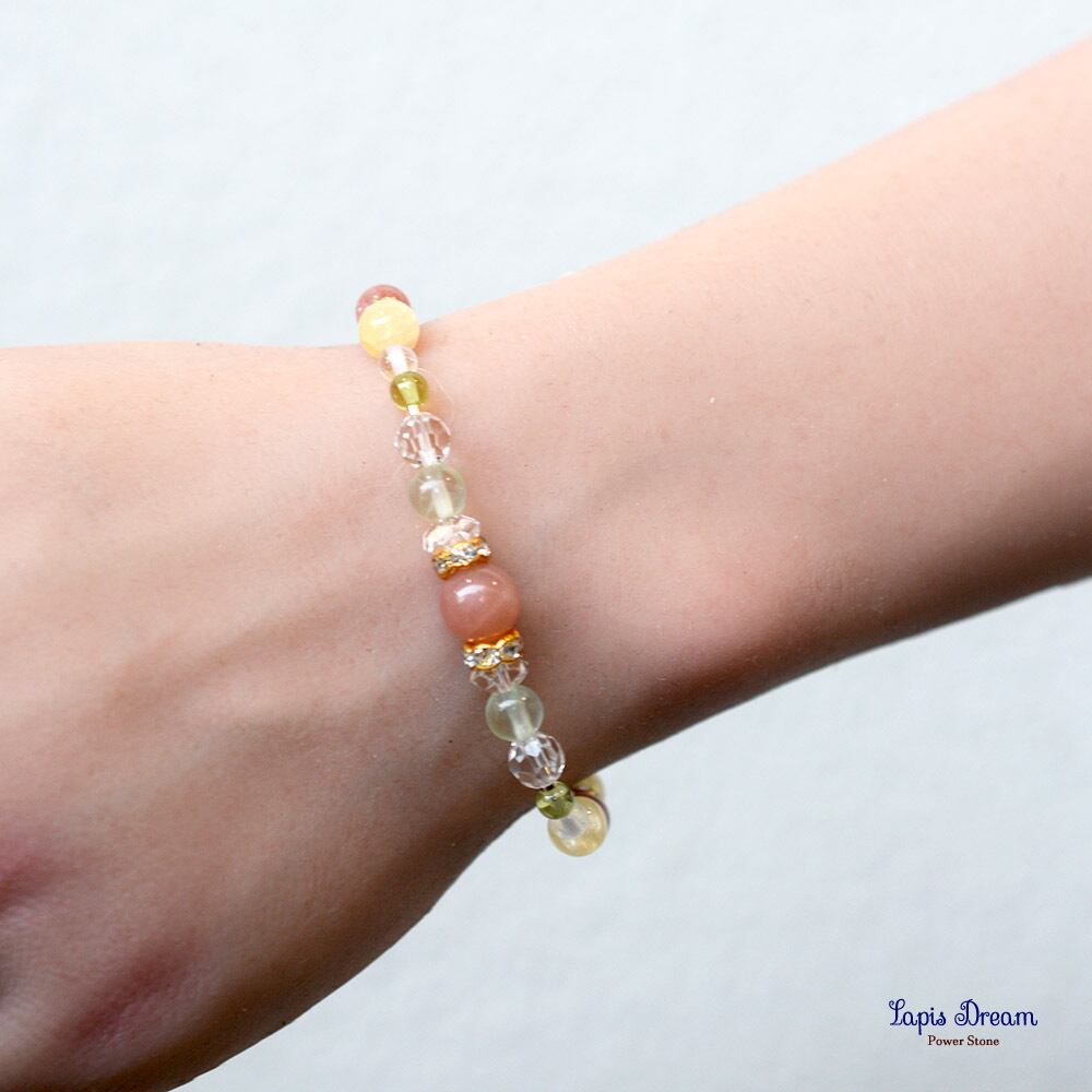 このブレスレットで使用しているローズクォーツ、モルガナイト、レインボームーンストーンは「恋愛成就」「夫婦円満」の効果があると古くから親しまれている天然石です。