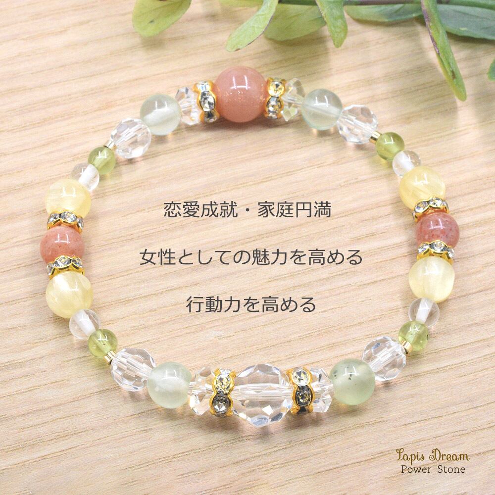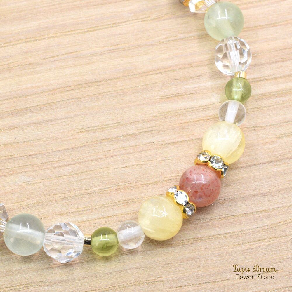 「リラックス効果がある」とされるイエローアラゴナイトを配し、恋愛も家庭も充実した生活にさせてくれるようなパワーストーン ブレスレットを制作しました。
