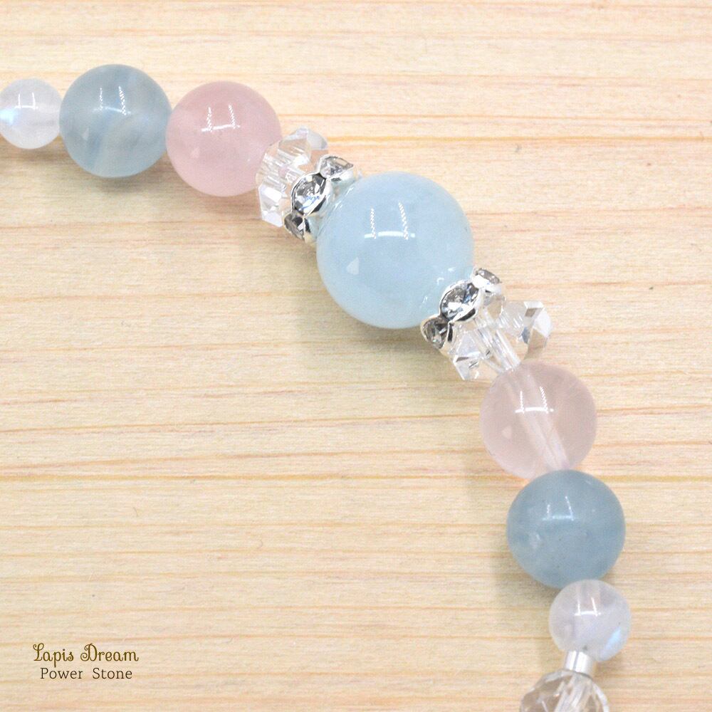 こちらのブレスレットで使用しているカイヤナイト、モルガナイト、レインボームーンストーンは特に「波動が高い石」と言われています。