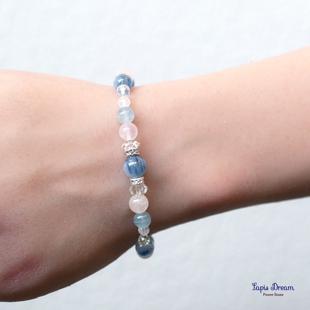 そんなカイヤナイトを中心に、「ポジティブ思考」「平穏な生活」に有効と言われるパワーストーンを配したブレスレットです。
