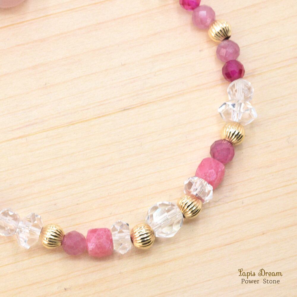こちらは、そんな「相手を思いやる気持ち」にさせてくれるローズクォーツをメインに、「恋愛成就・家庭円満」「良好な人間関係」の効果がある天然石で組んだブレスレットです。