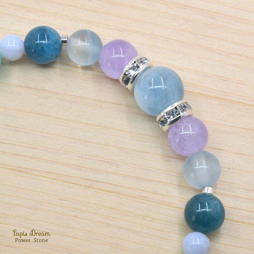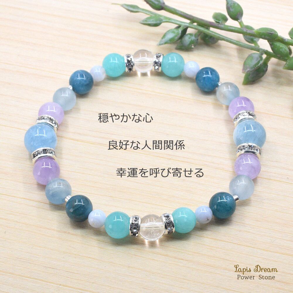 そのアクアマリンを中心に据えて、「精神を安定させる」「対人関係を円滑にする」効果のある天然石で制作したブレスレットです。