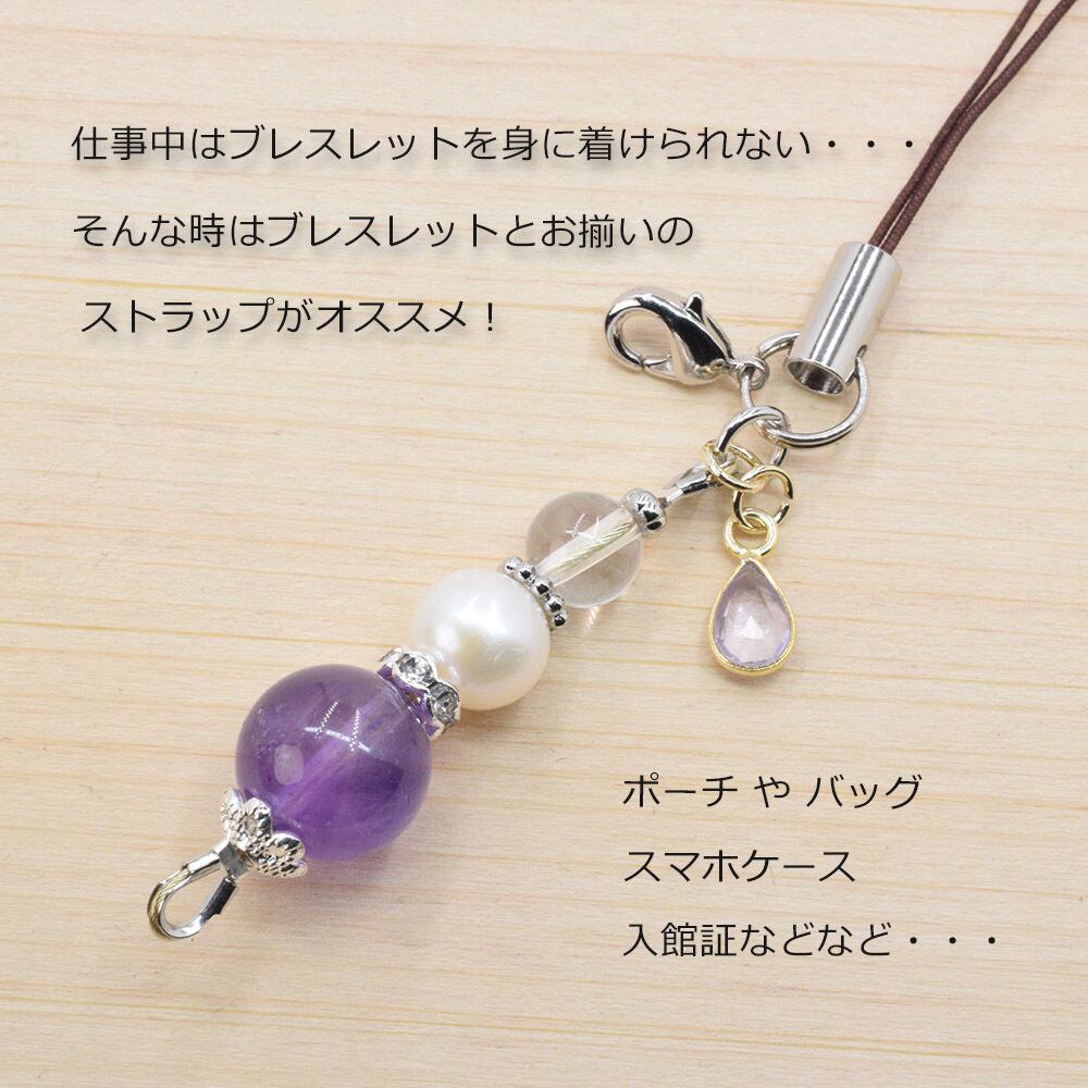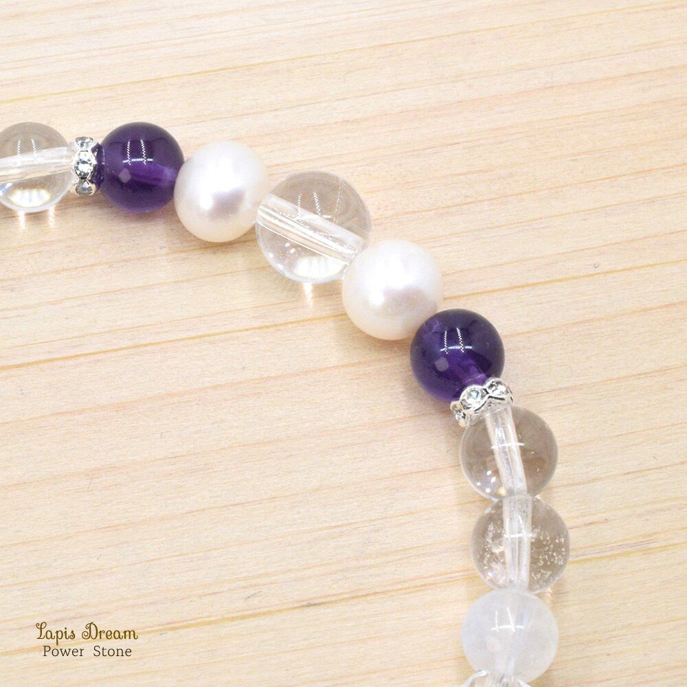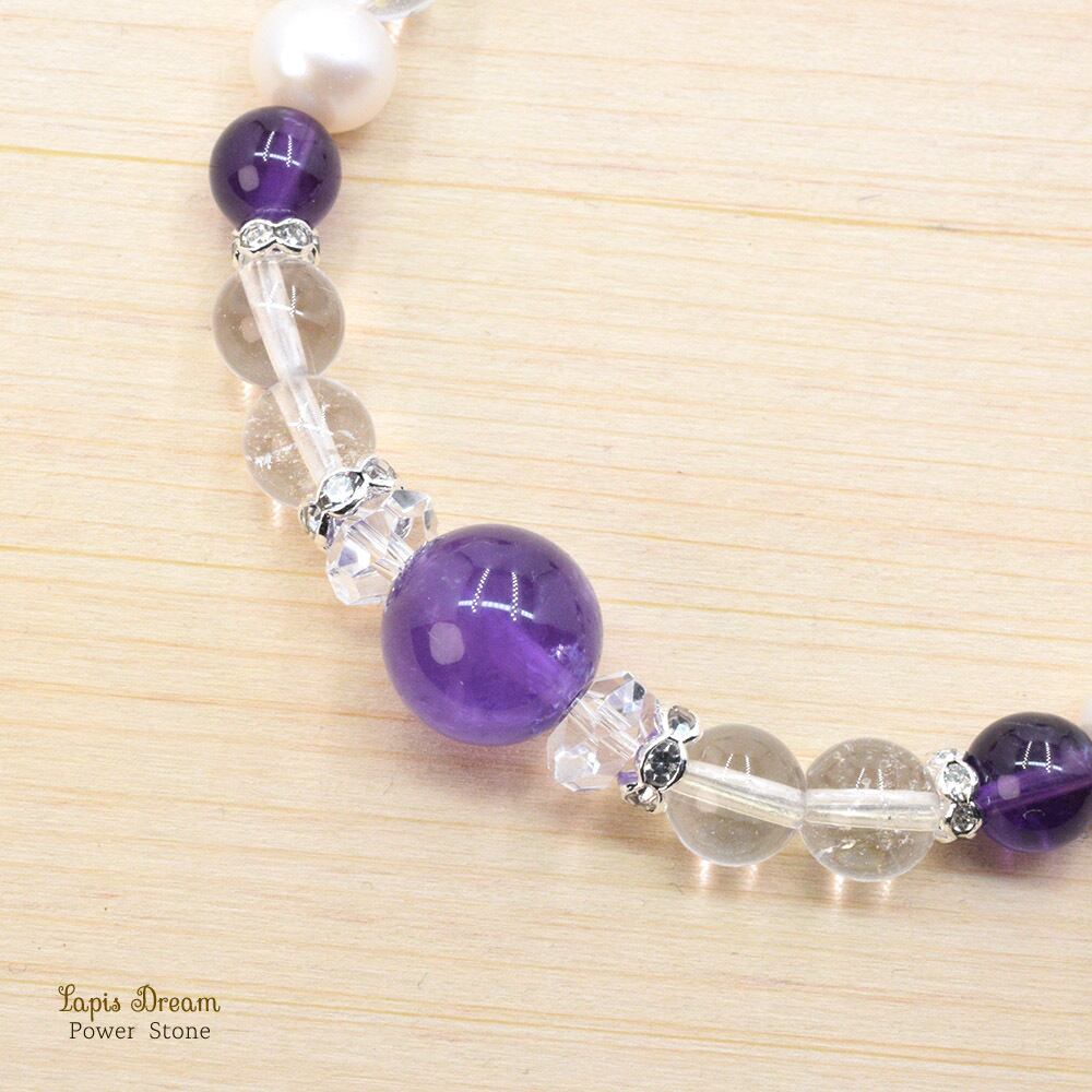 そんなアメジストを中心に、「悪い物から身を守る」「幸運を呼び寄せる」と言われる浄化能力の高い 淡水パール や ヒマラヤ水晶 を組み合わせた「マイナスの感情を取り払い、運気を上昇させるお守り」を制作しました。