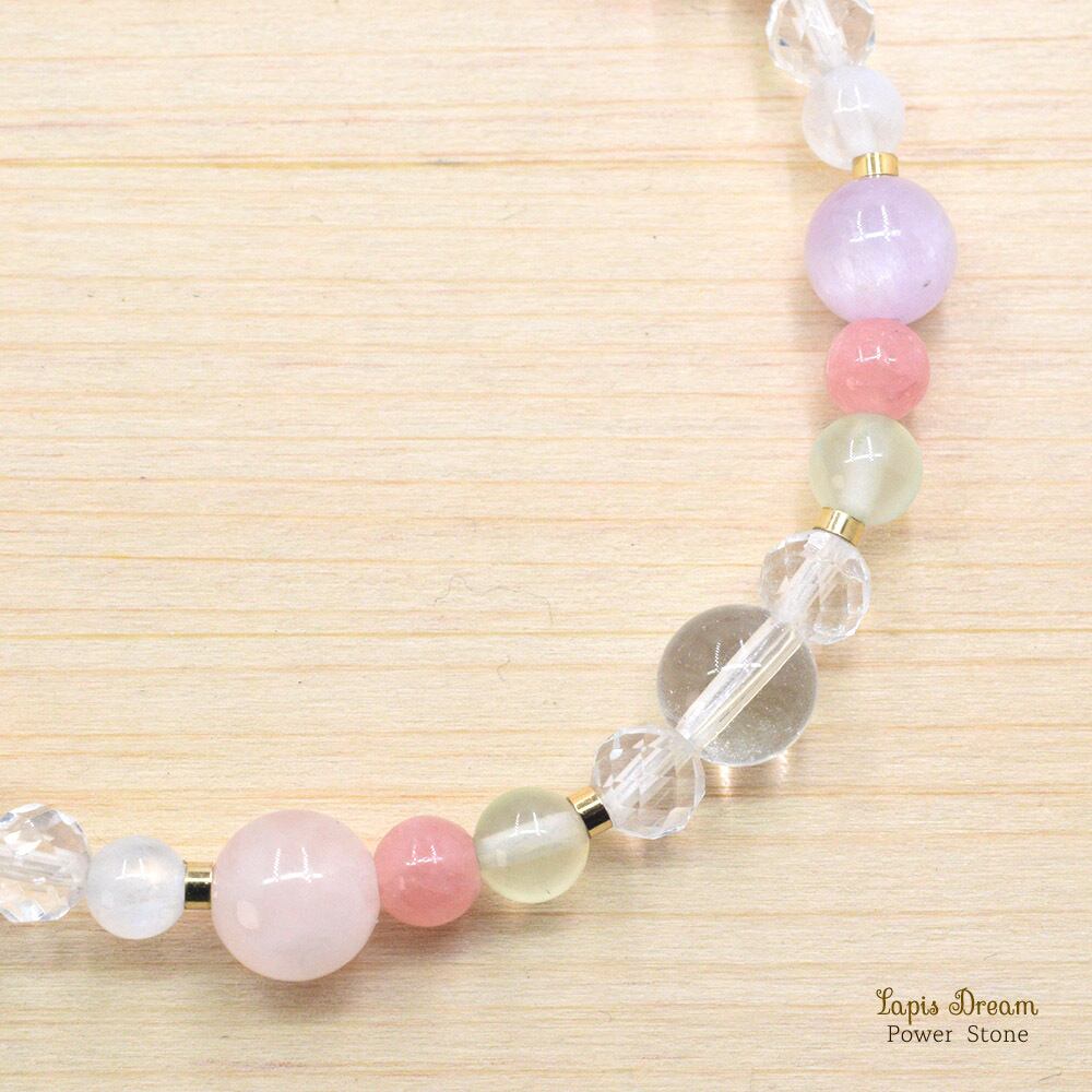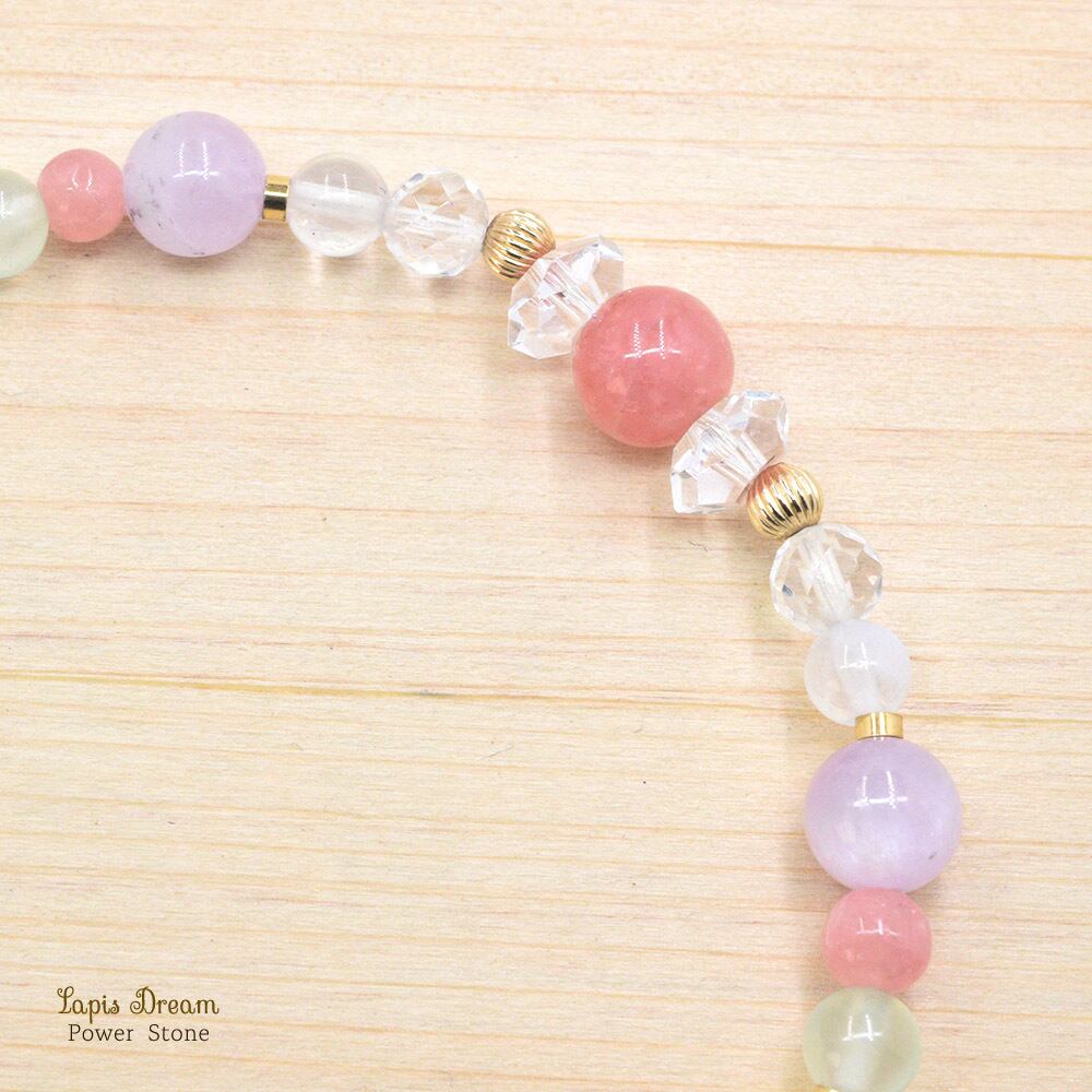 そんなインカローズに「恋愛成就・夫婦円満」や「精神安定」「癒し」の効果があるモルガナイトやクンツァイトを組み合わせて、優しさに溢れるパワーストーン ブレスレットを制作しました。