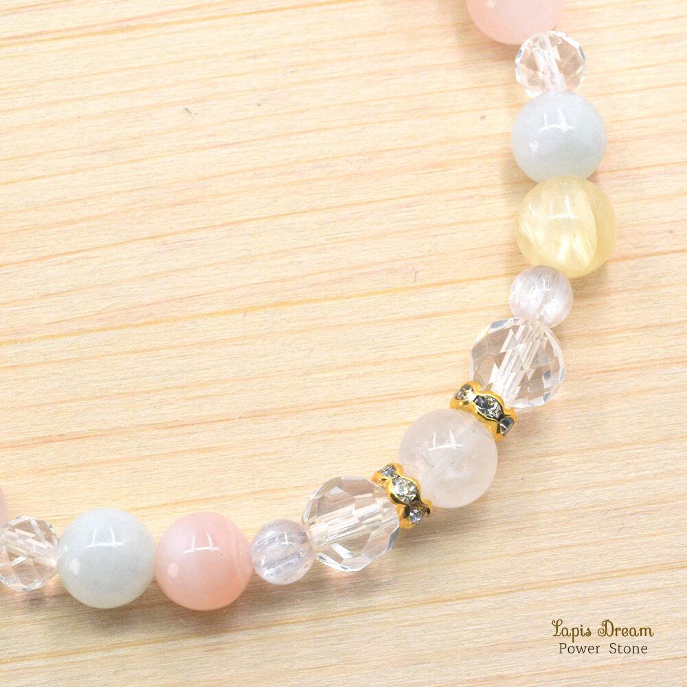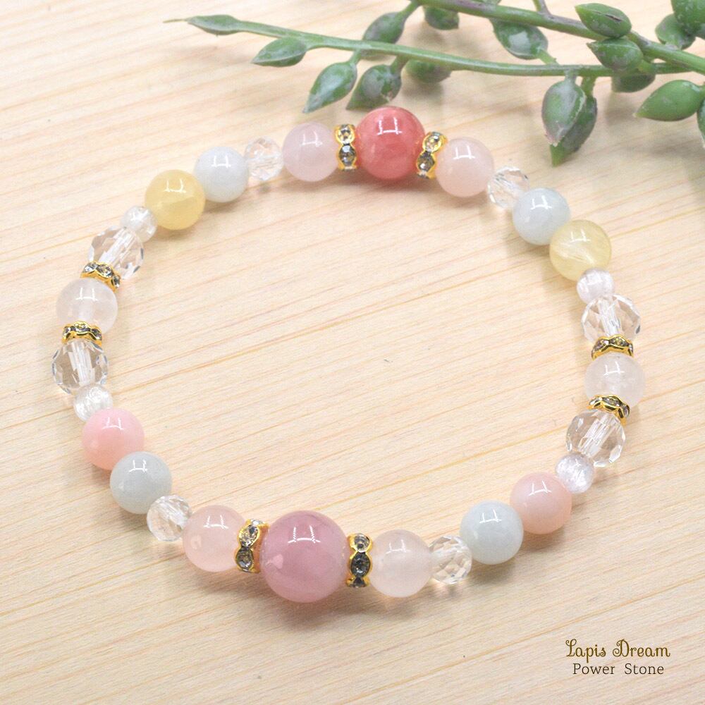 この2種類の人気の石をメインに、「癒し」「穏やかな心」の効果のある天然石を散りばめた素敵なパワーストーン ブレスレットを制作しました。