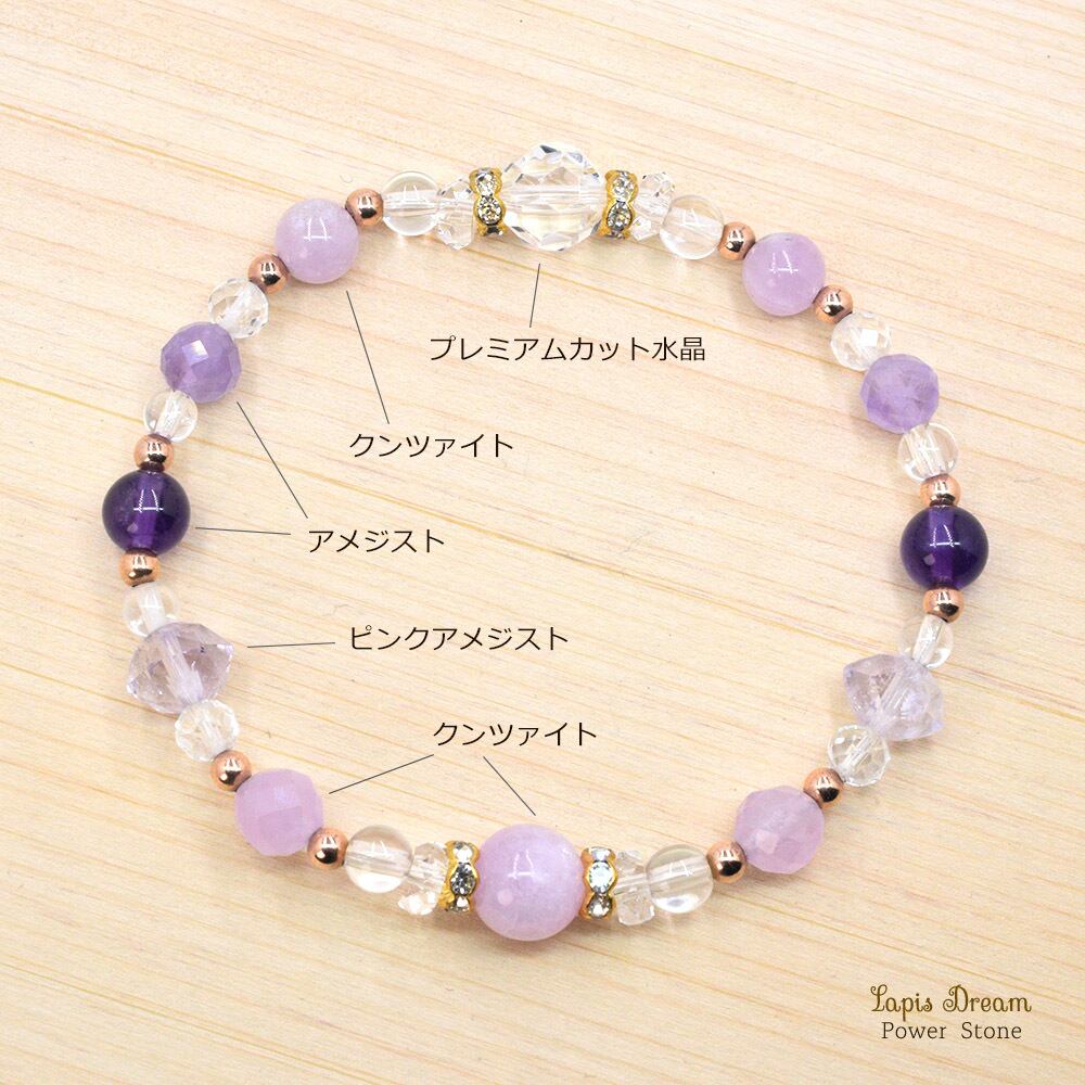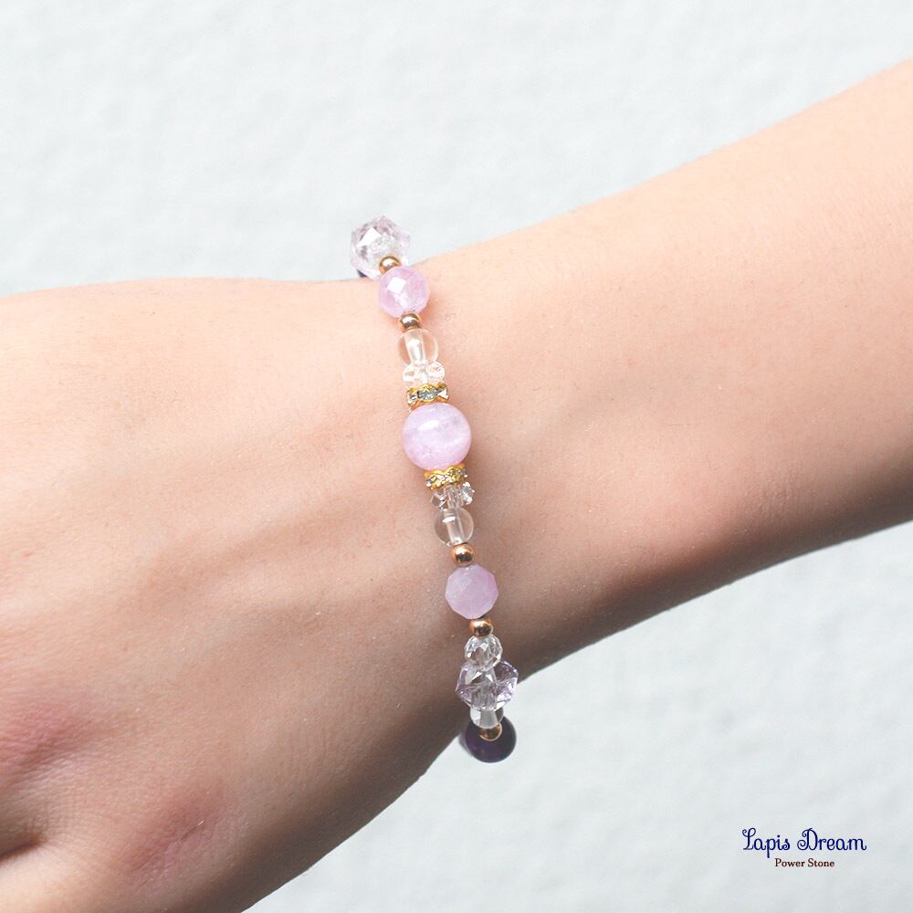 「愛と慈悲の象徴」と言われるクンツァイトをメインに、「愛の守護石」の石言葉を持つアメジストを組み合わせて、愛に満ちたパワーストーン ブレスレットを制作しました。