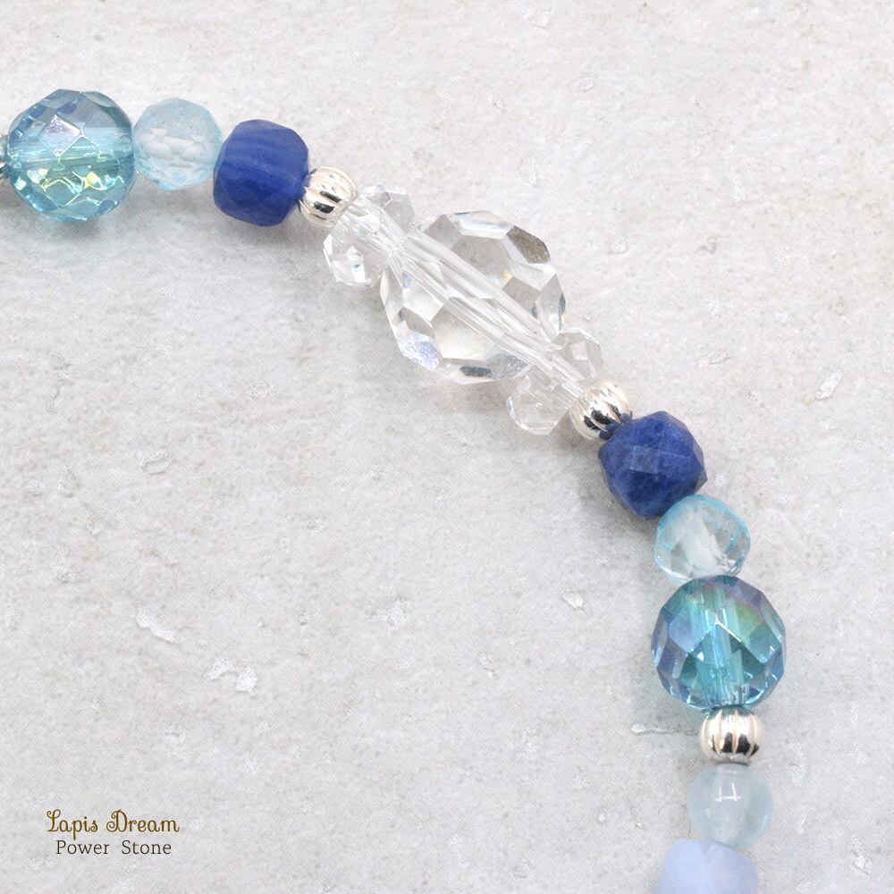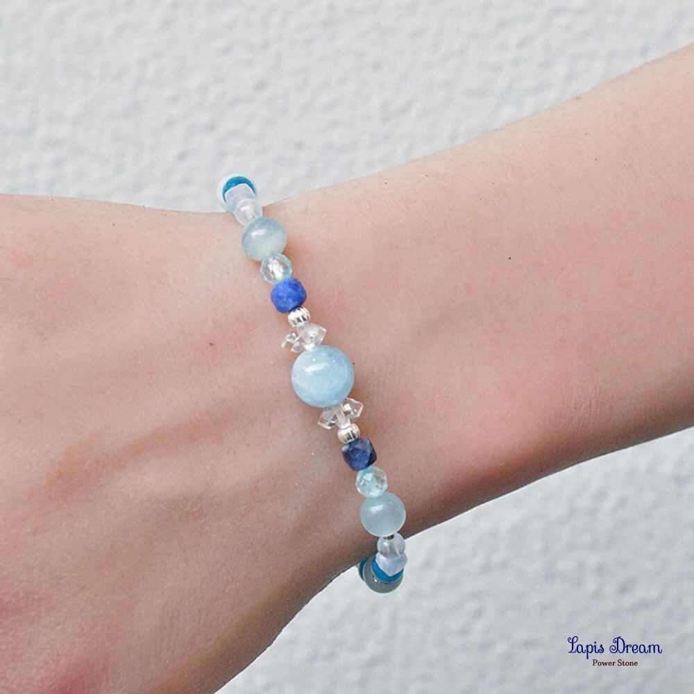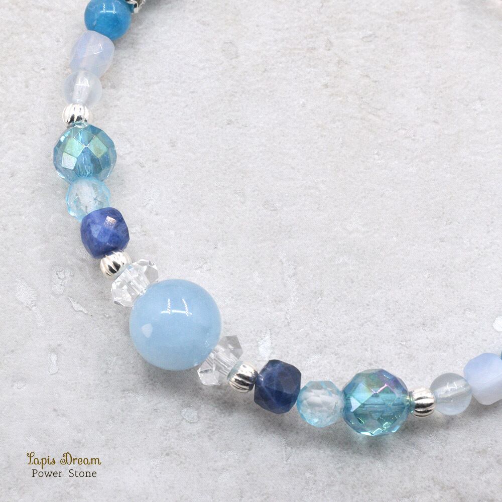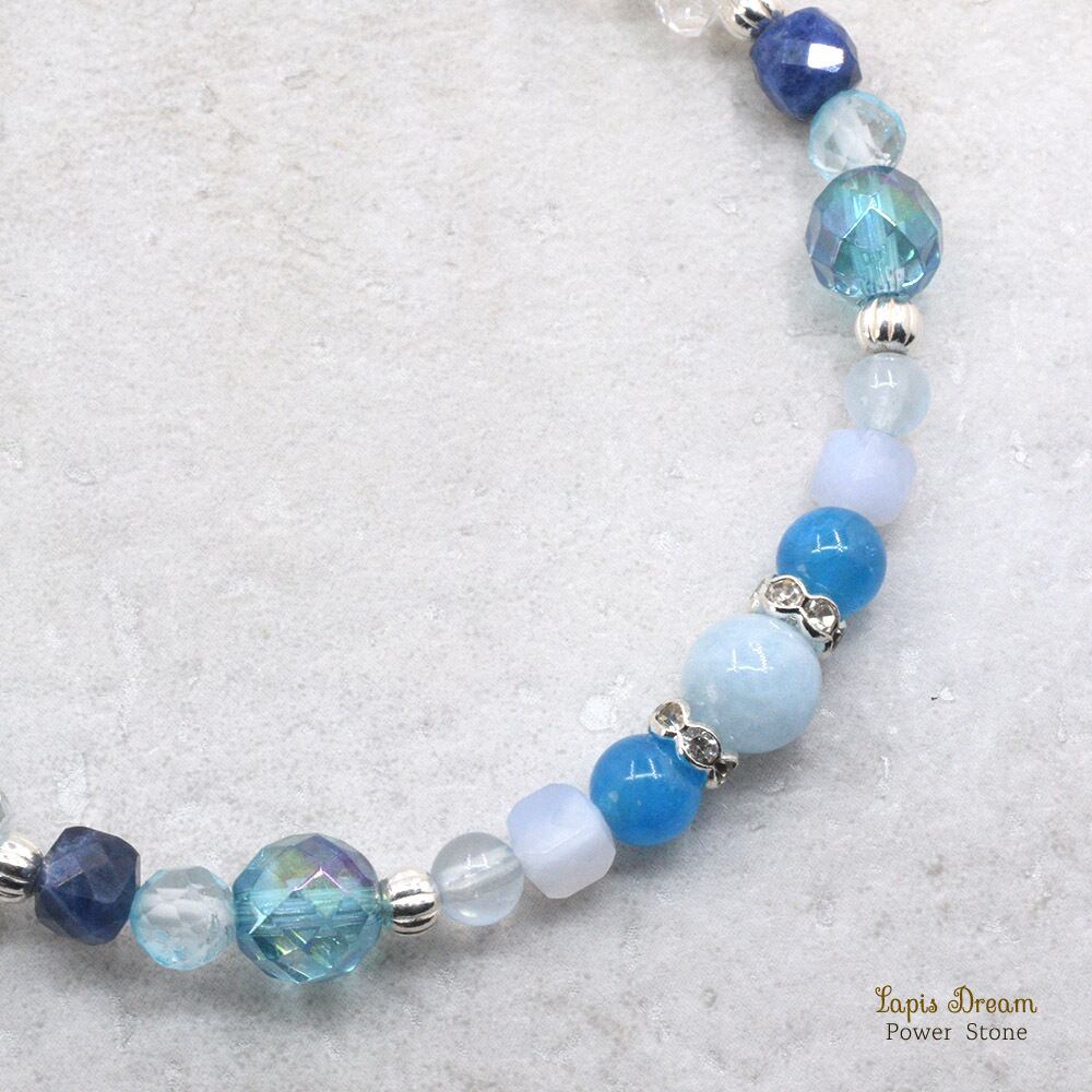 様々な種類の、美しいブルーの天然石を散りばめたパワーストーン ブレスレットです。