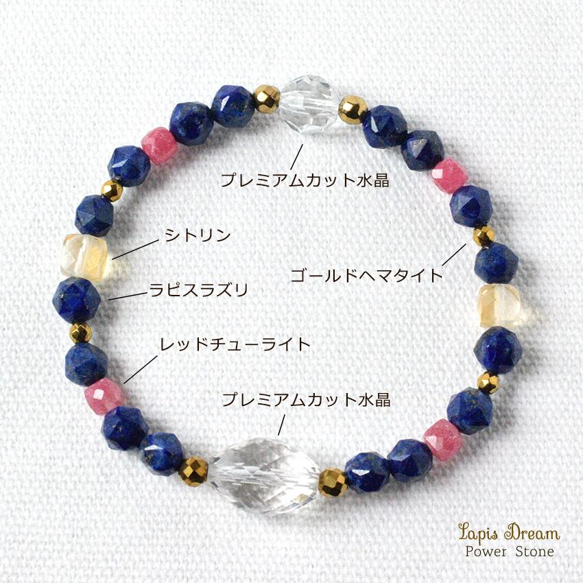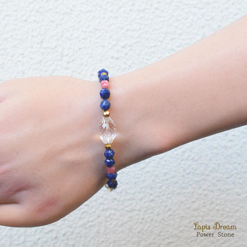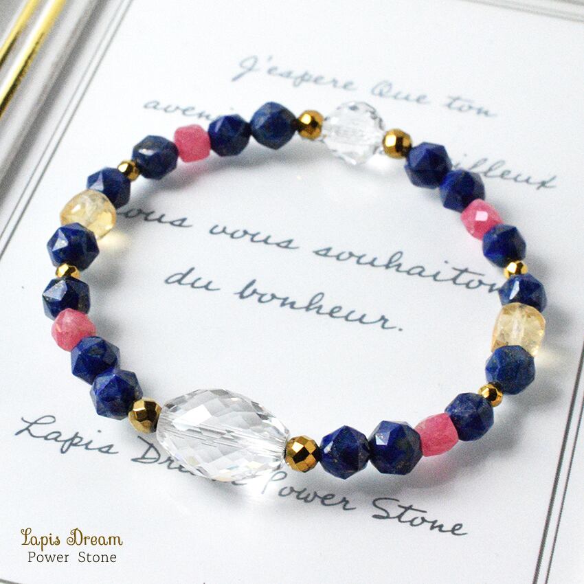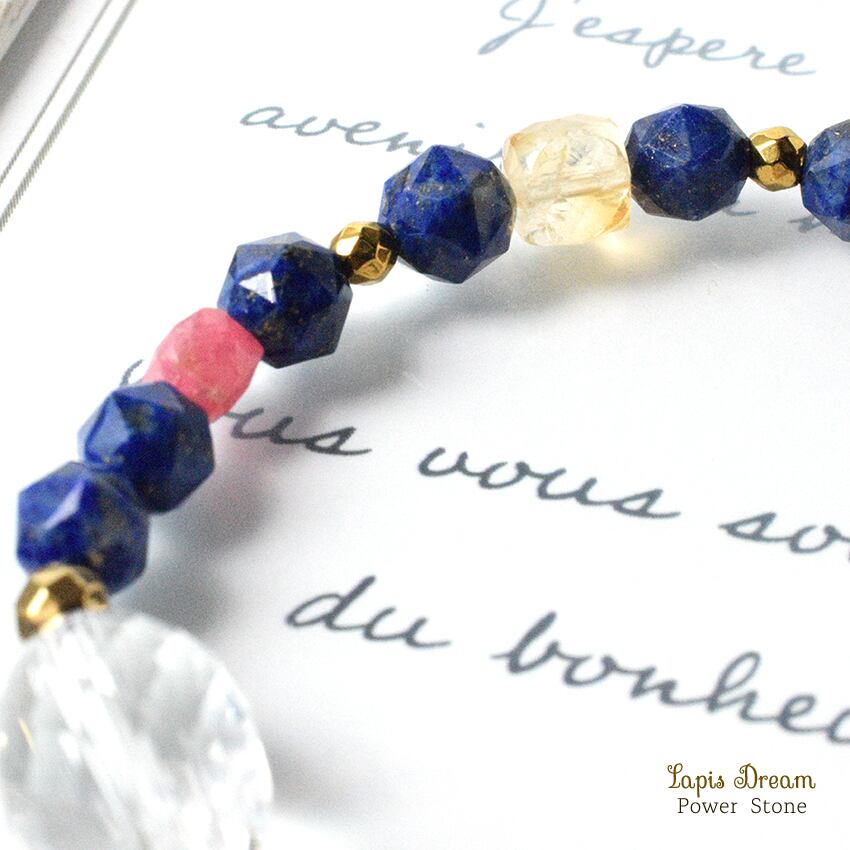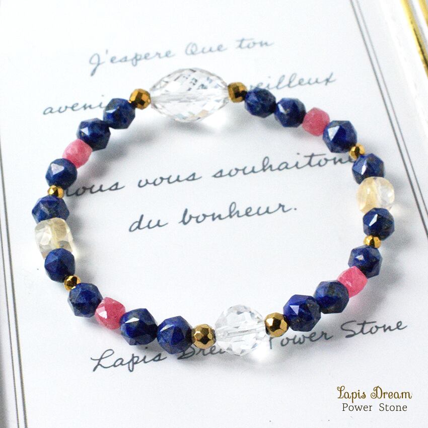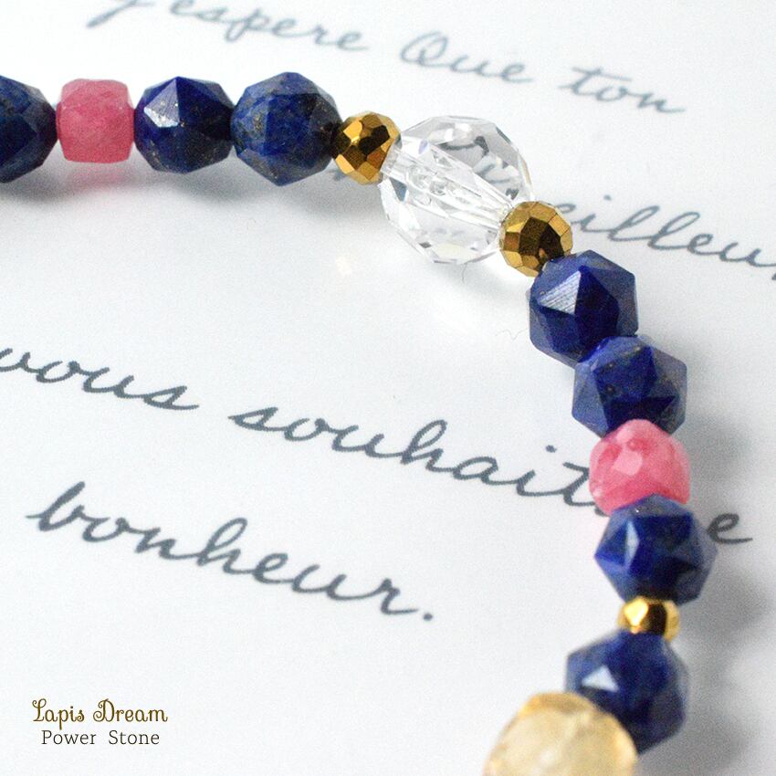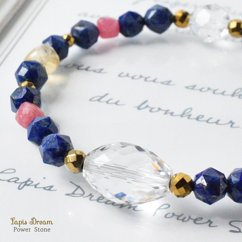 「幸運を引き寄せる石」として古代から愛されている、波動の強いラピスラズリを中心に、ポジティブなエネルギーに変える効果の天然石を使っています。