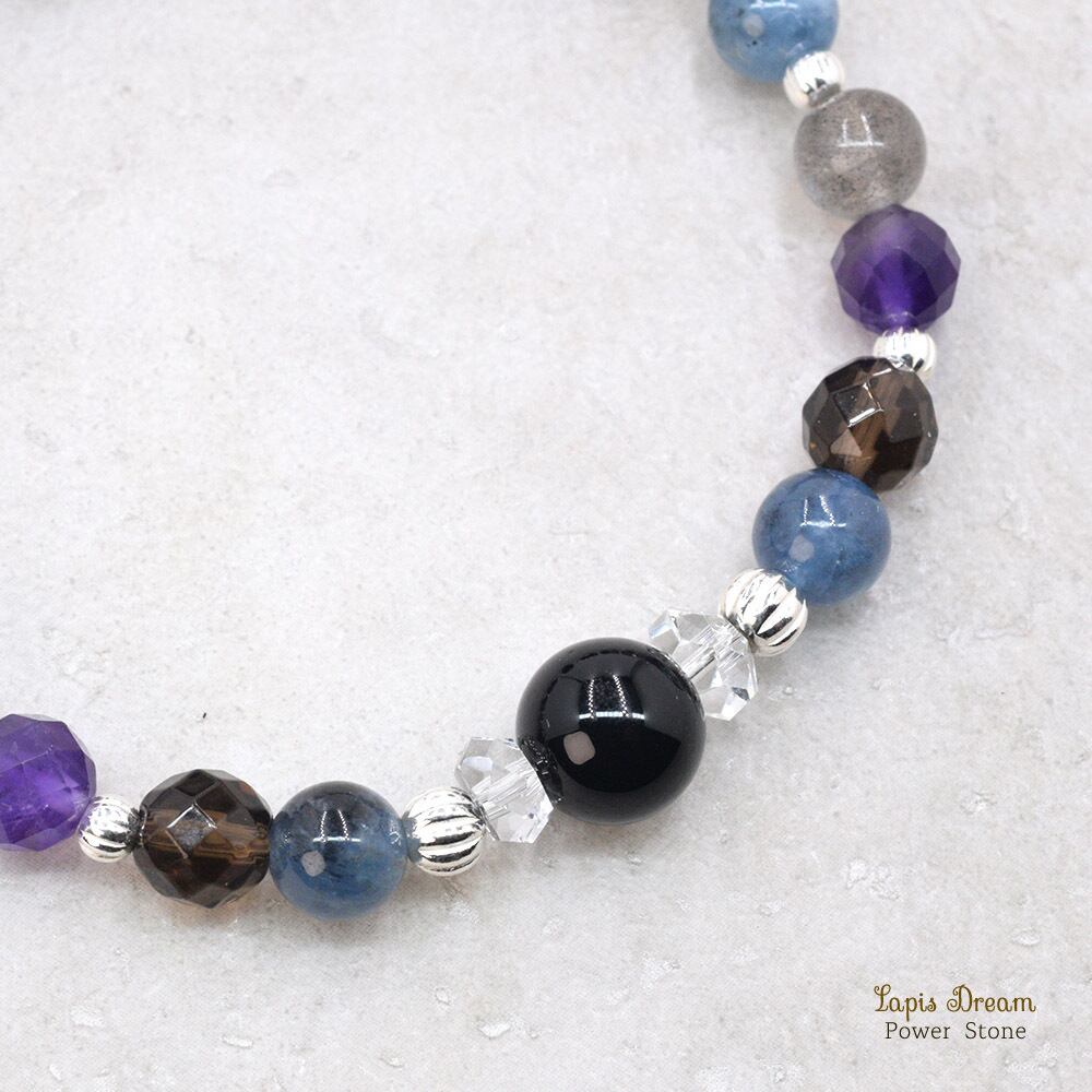 そのオニキスを主役に、マイナスの感情を祓い、物事を好転させるエネルギーのある石を組み合わせて制作したパワートーン ブレスレットです。