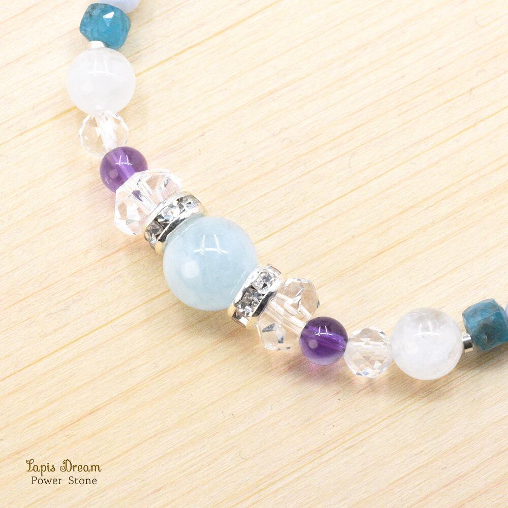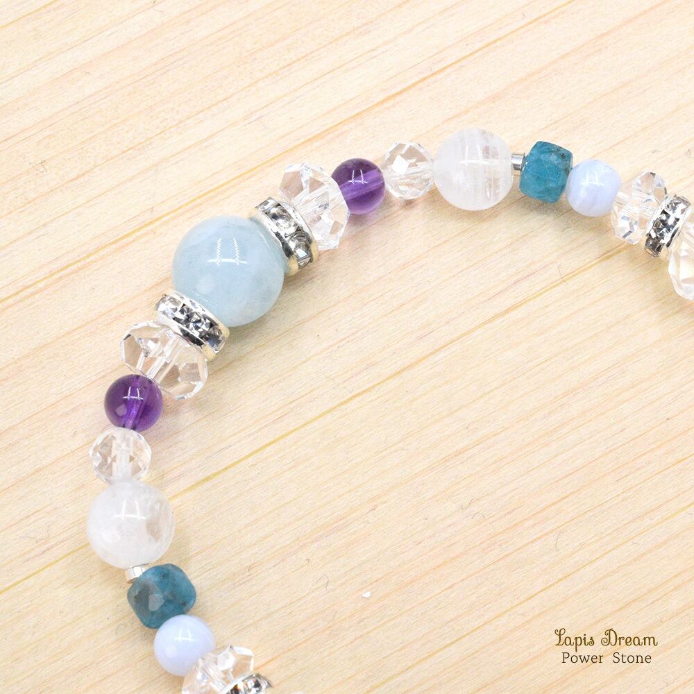 このアクアマリンをメインに「穏やかな気持ちになる」ブルー系のパワーストーンを組み合わせました。